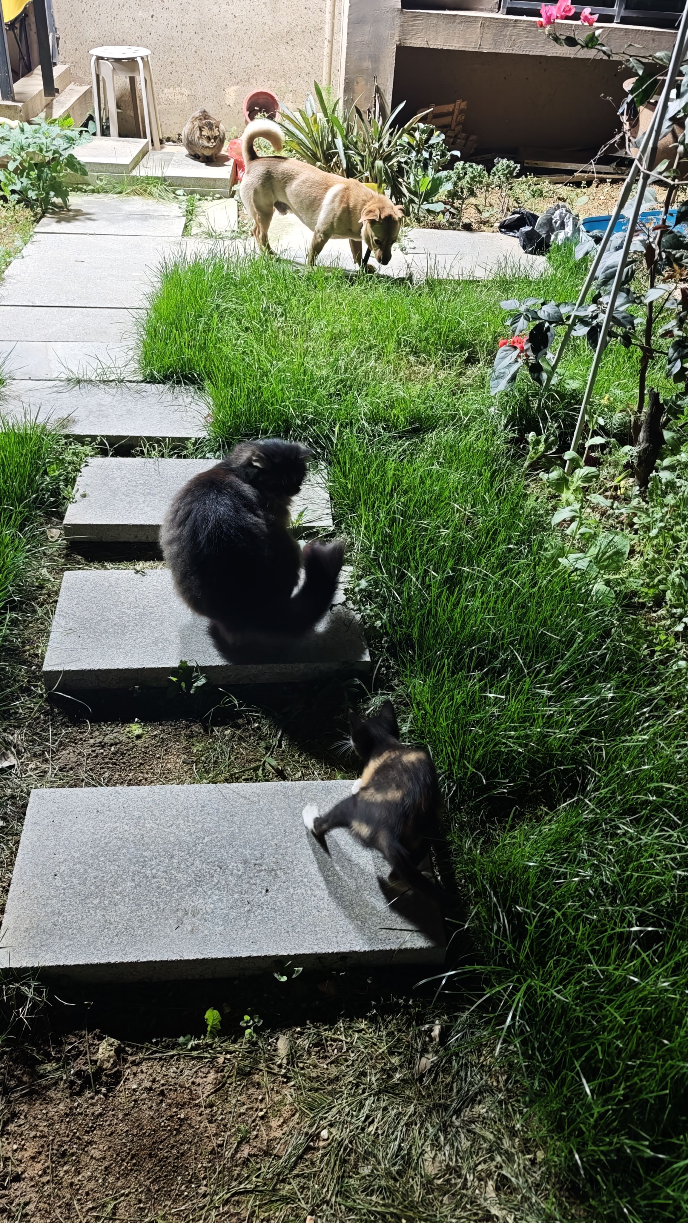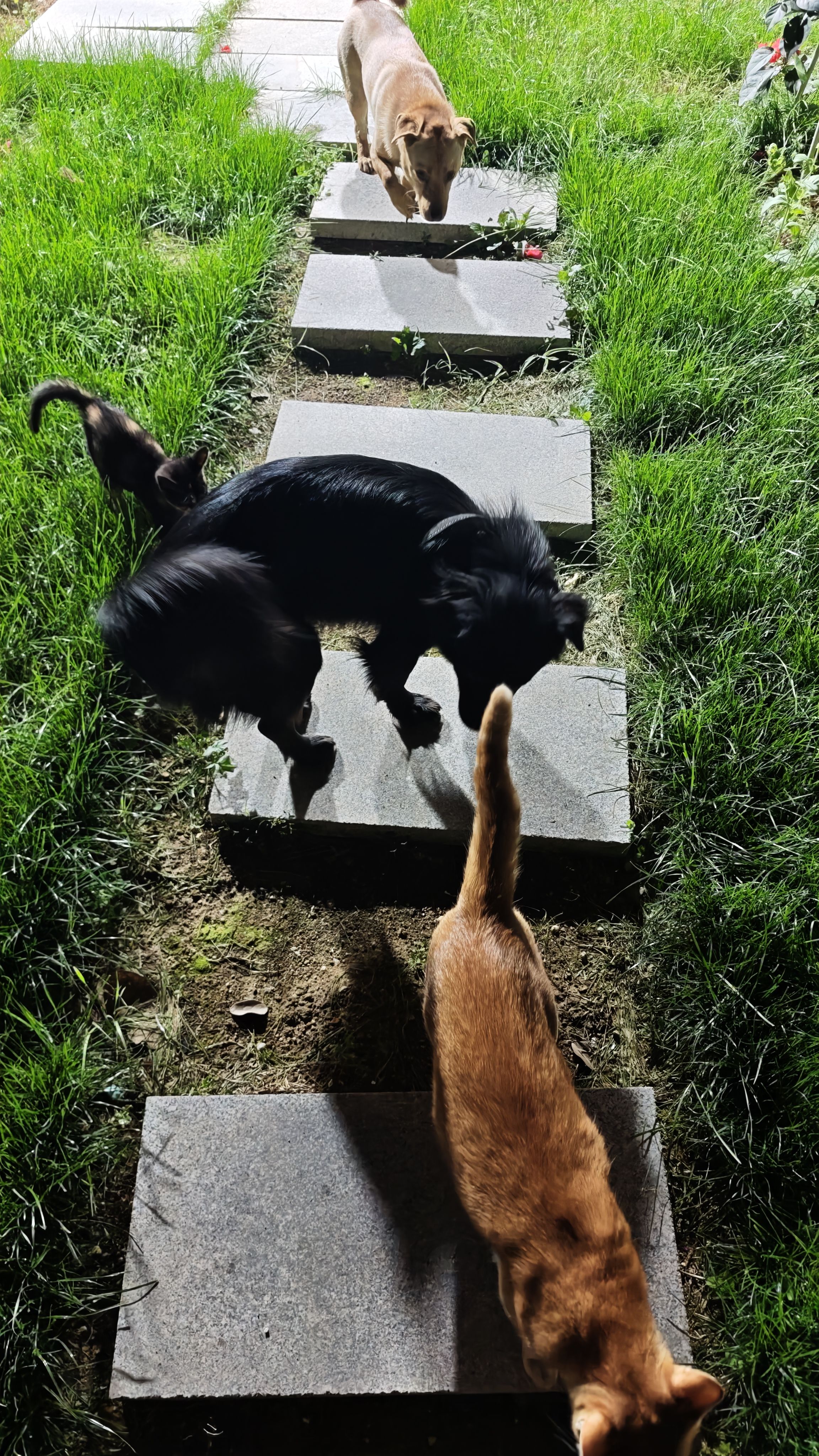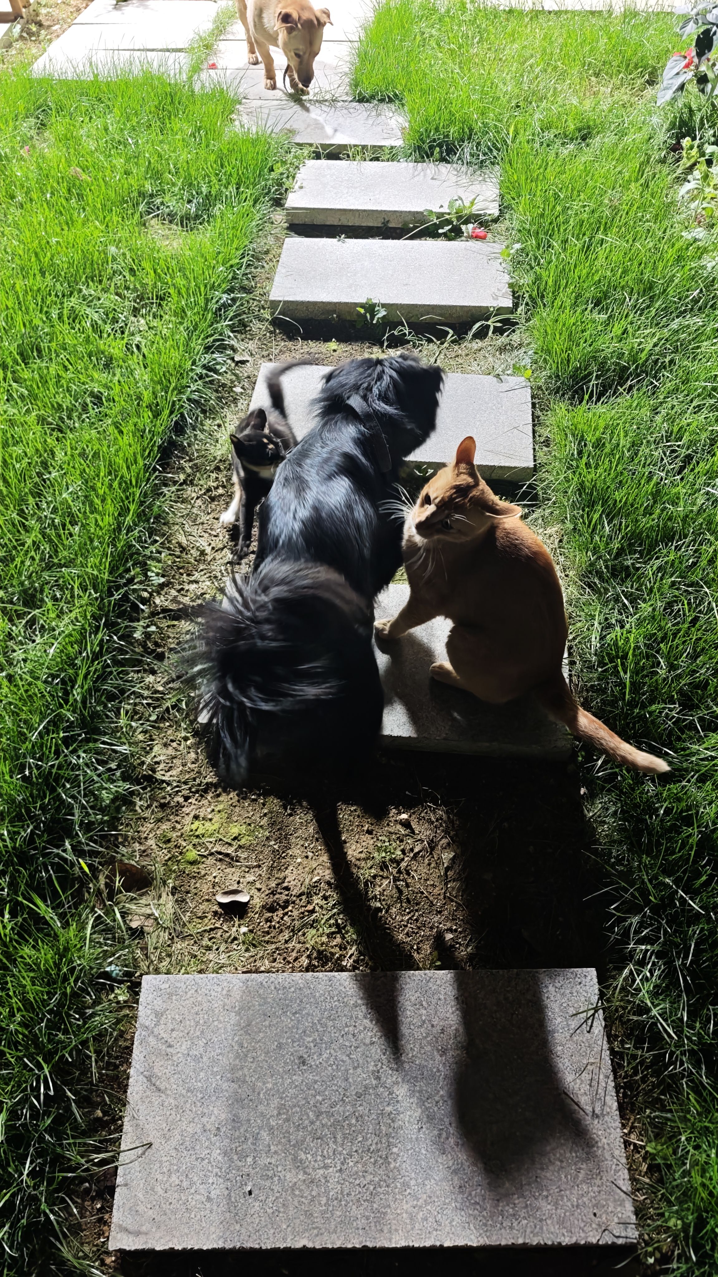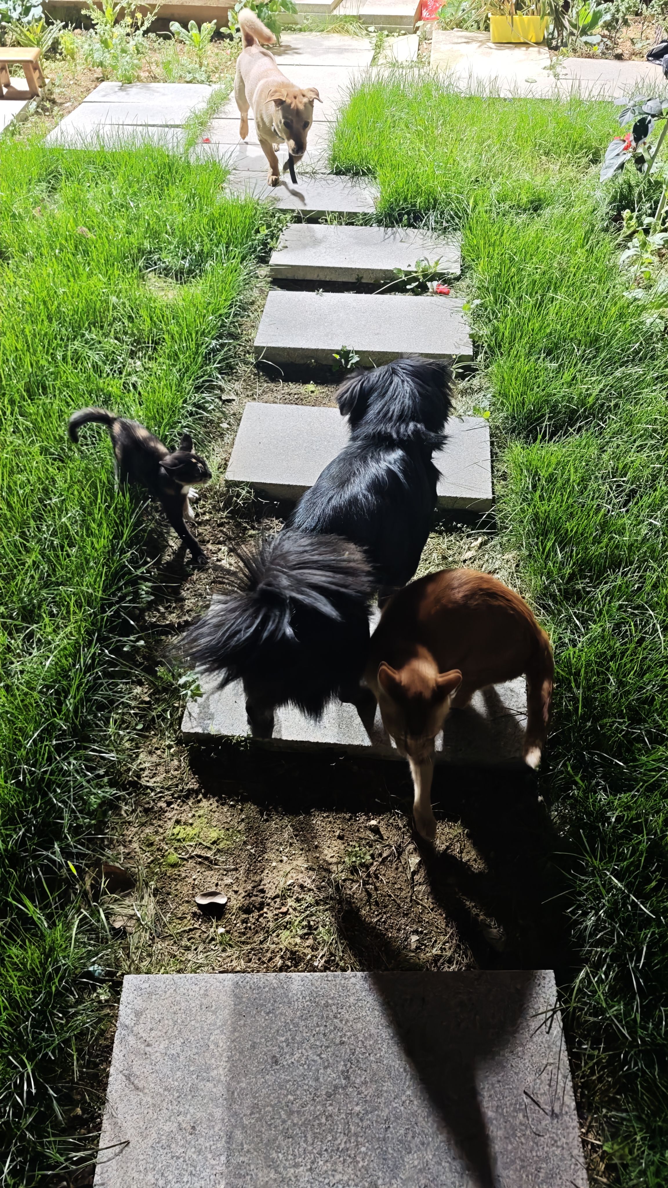 和朋友吃完饭回来,毛孩子们都出来院子里走走。