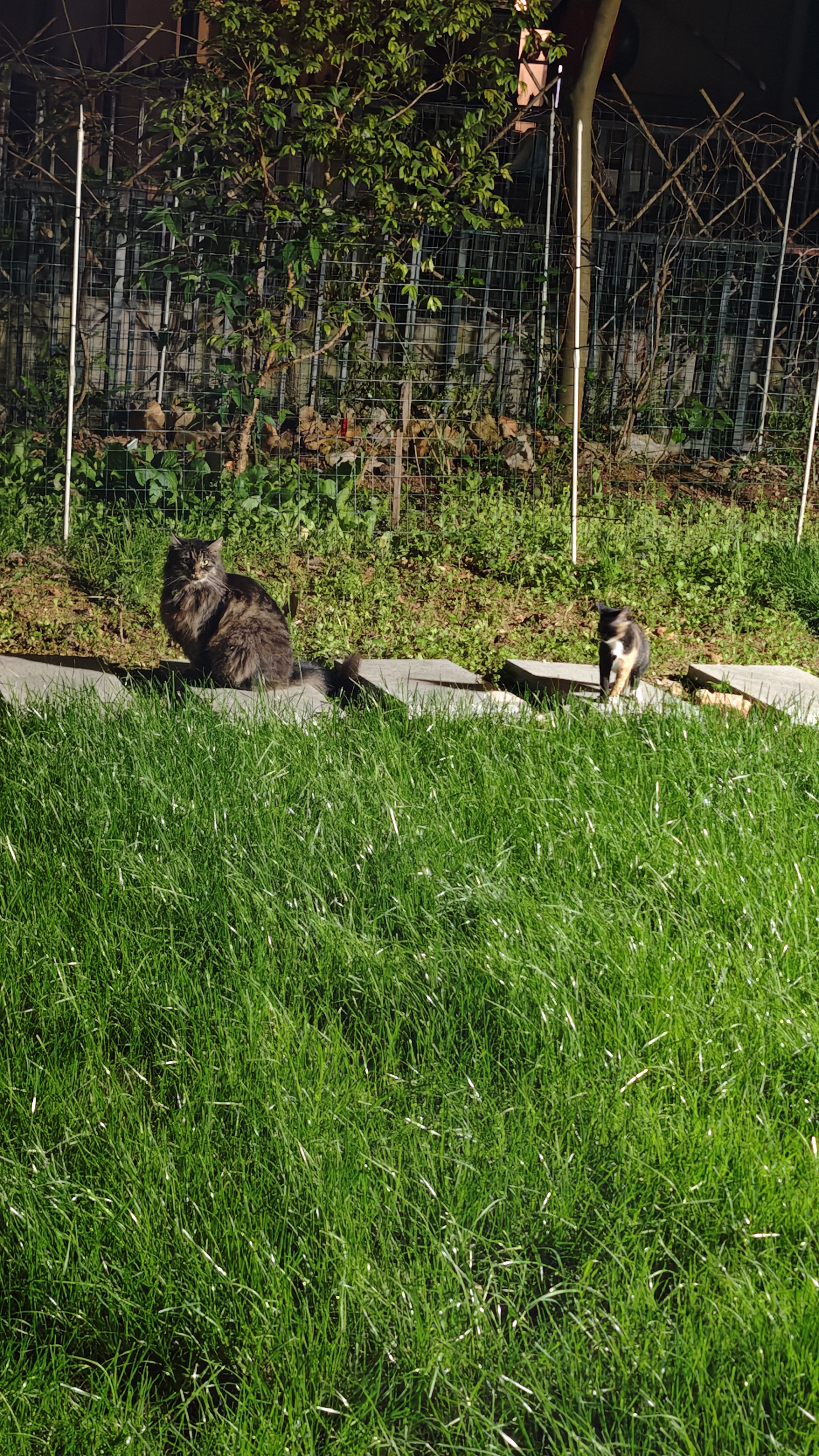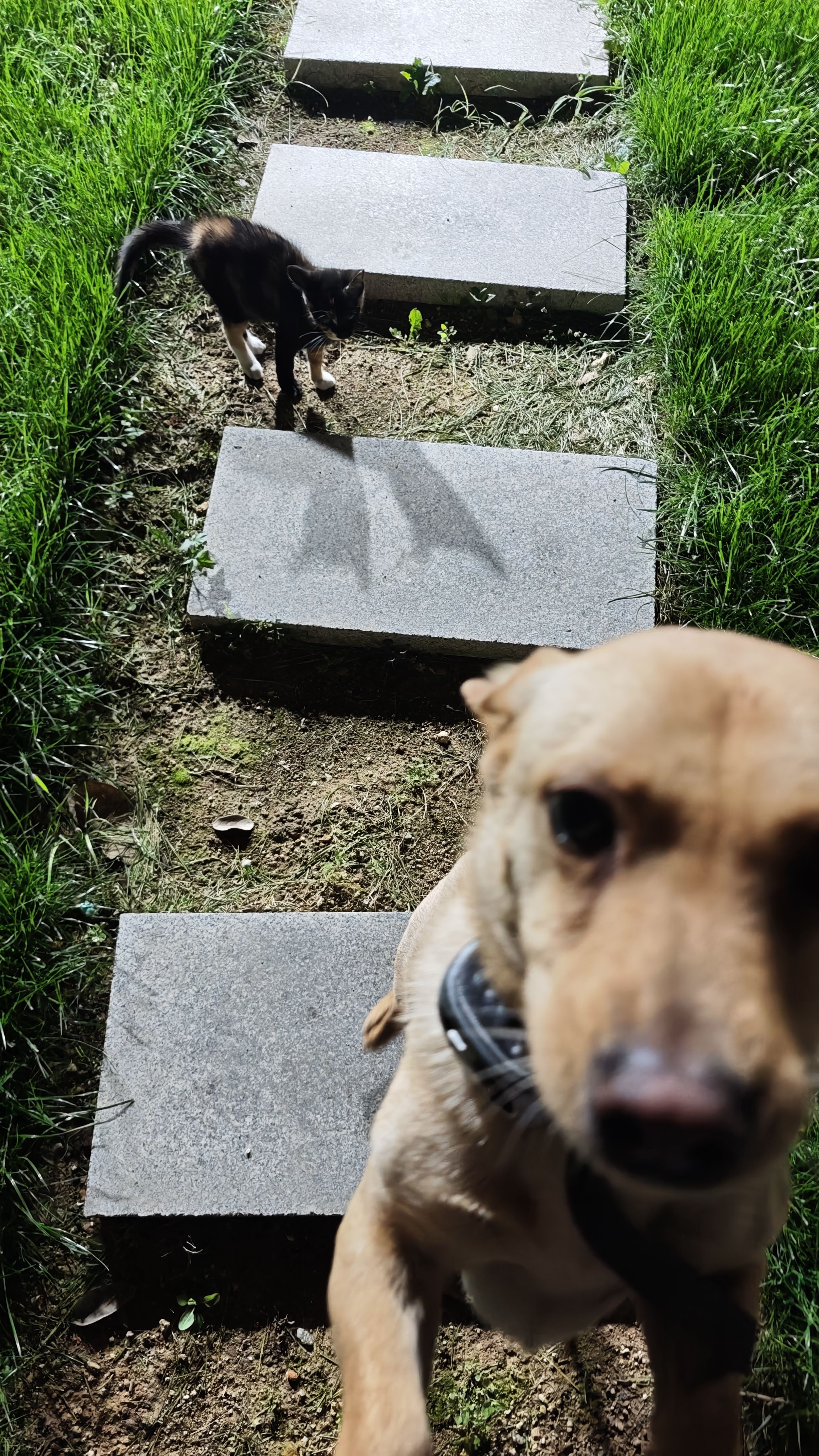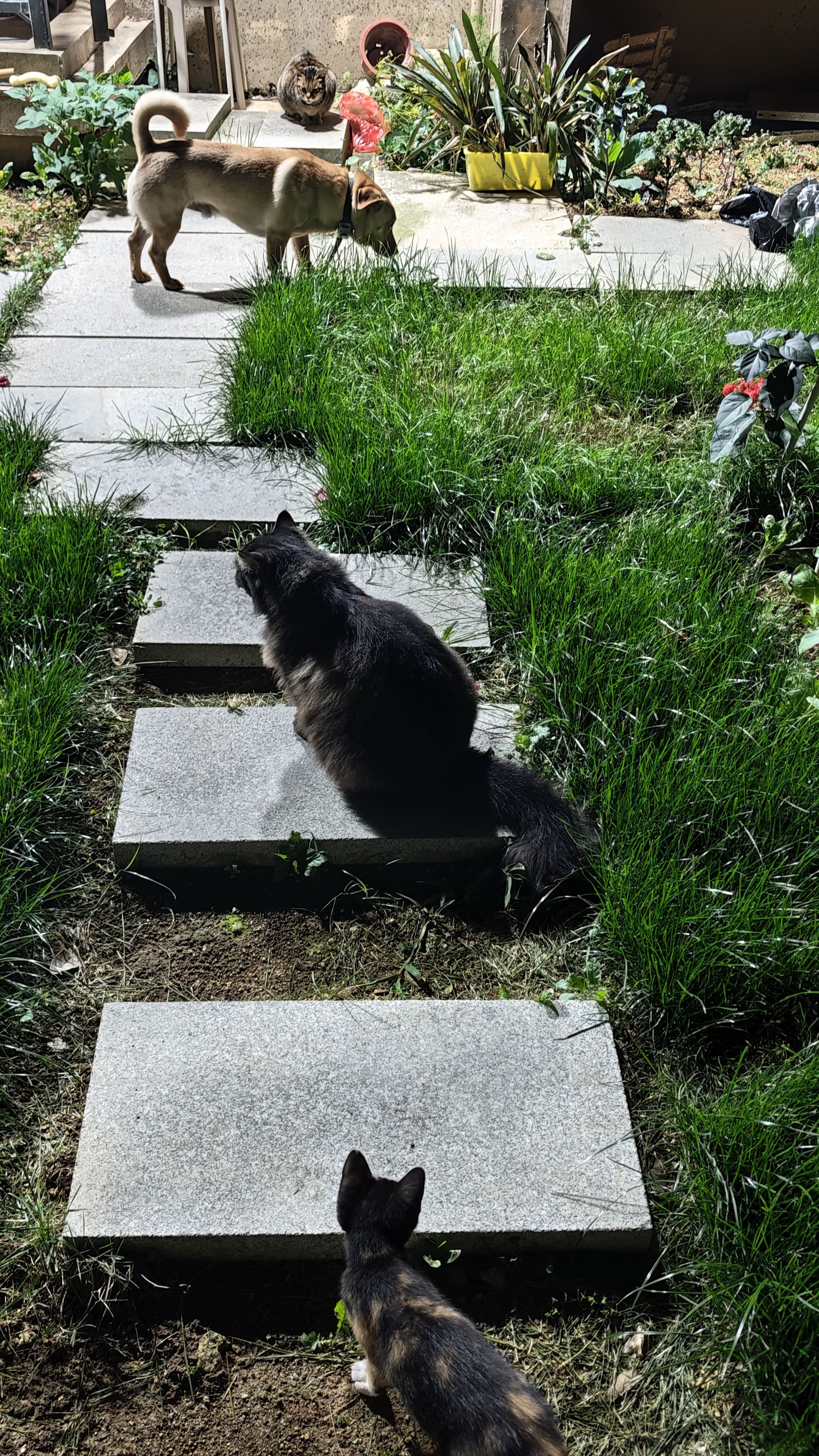 和朋友吃完饭回来,毛孩子们都出来院子里走走。