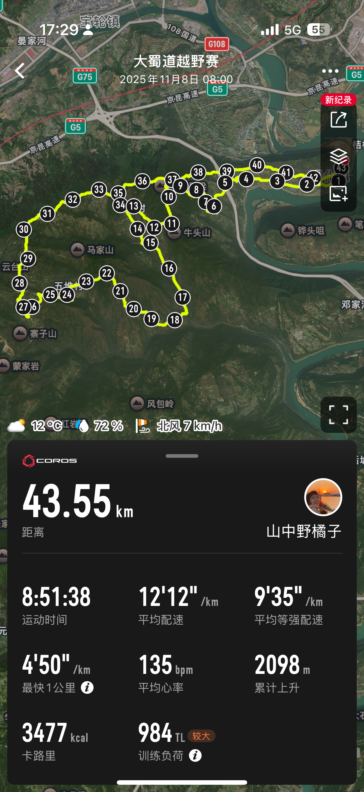 如上周我在山里暴走,沿着山脊开路的状态(图 1️⃣)