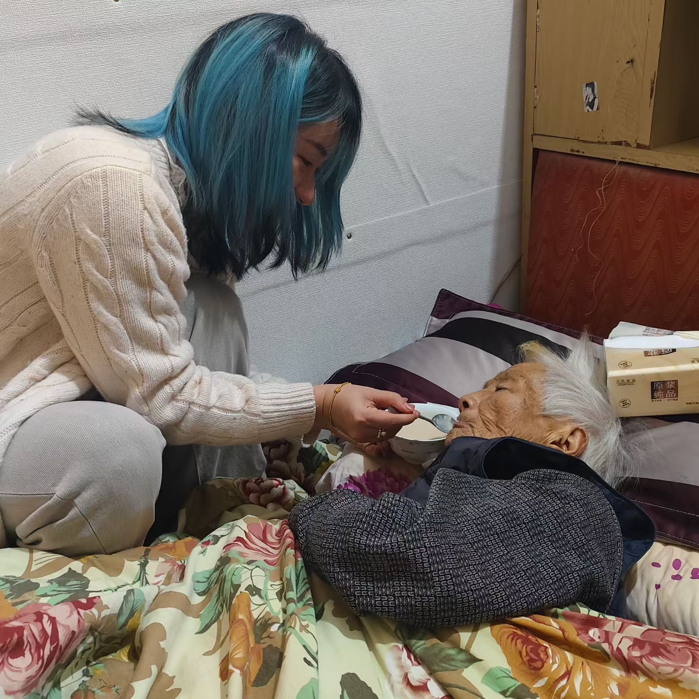 奶奶已经几乎丧失吞咽功能了,只能骗她再吃一口就给香烟。