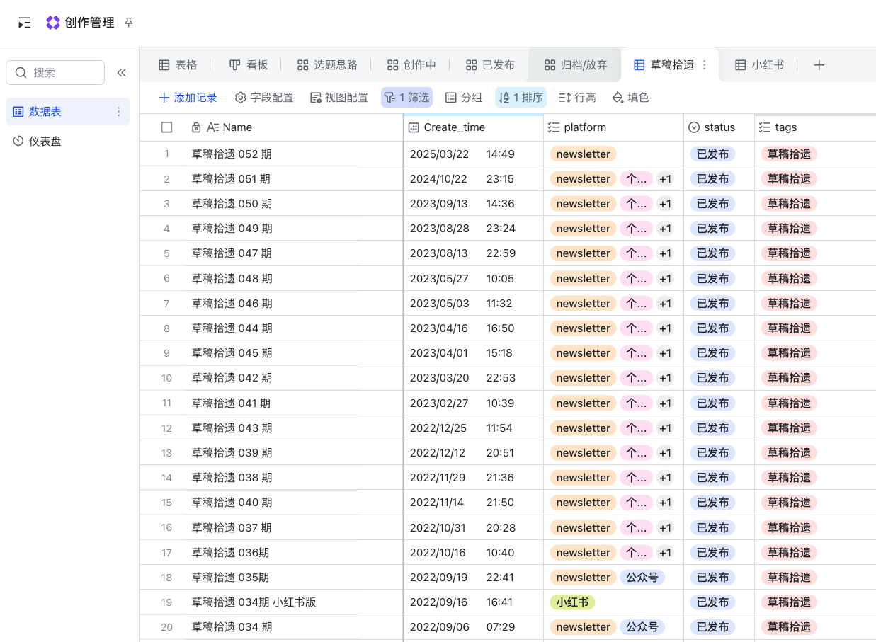 数据维护在飞书多维表格以后,好处是它提供了很灵活的数据组织方式。你可以根据任何条件和排序来筛选内容,随意切换查看方式。像我就把我的 Newsletter 和小红书发布内容都单独管理起来了,清晰又高效。(P2)