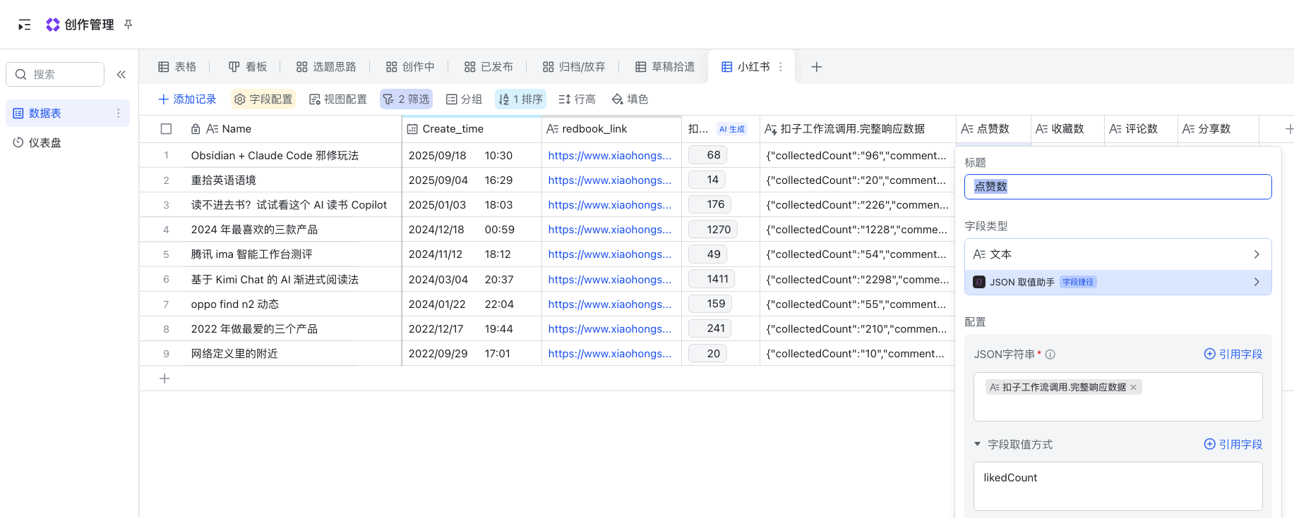 例如我就做了一个 Coze 的工作流来获取我的小红书作品的实时数据,再通过[JSON 解析]这个插件来解析点赞数,收藏数等数据,最终每一篇内容发布后的数据反馈。(P4)