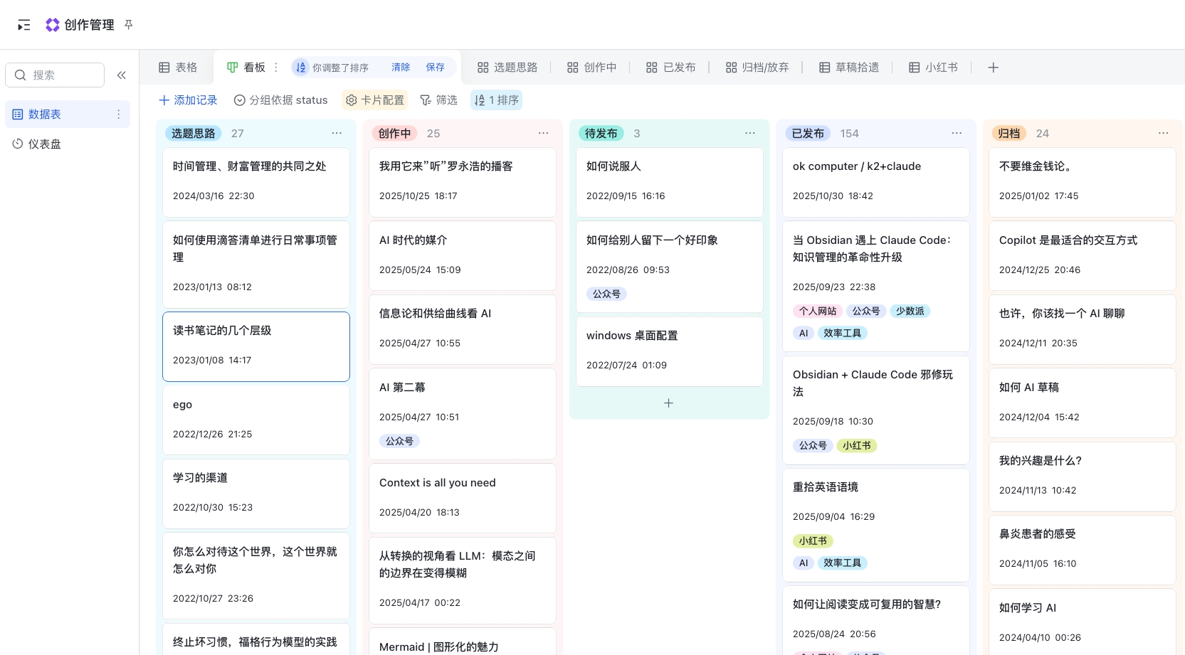 最近发现,飞书多维表格很适合用来做个人的创作管理。