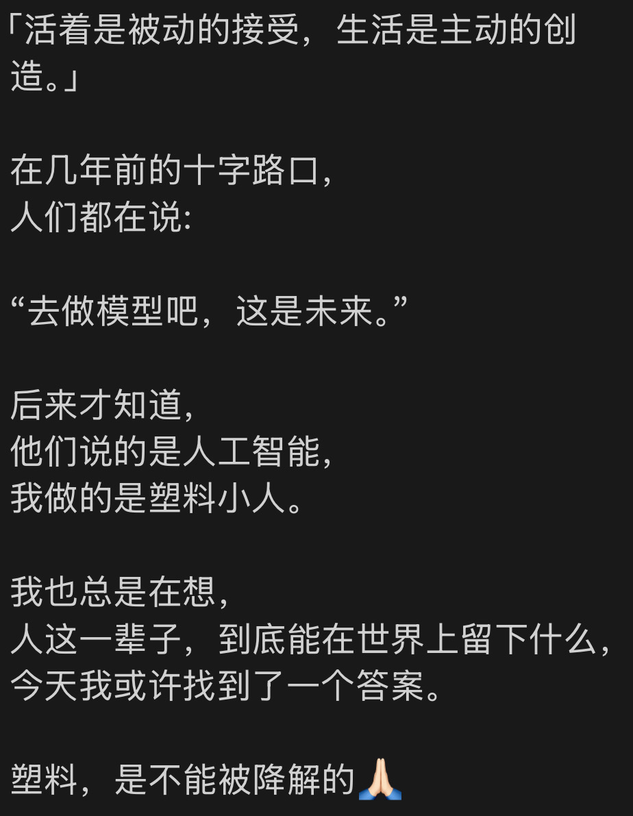 前一阵我老弟跟我说他在做模型方面的工作,是具身/机器人方向的。不融资也不为赚钱,说人活一世总要留下点什么(指无法被降解的塑料)…