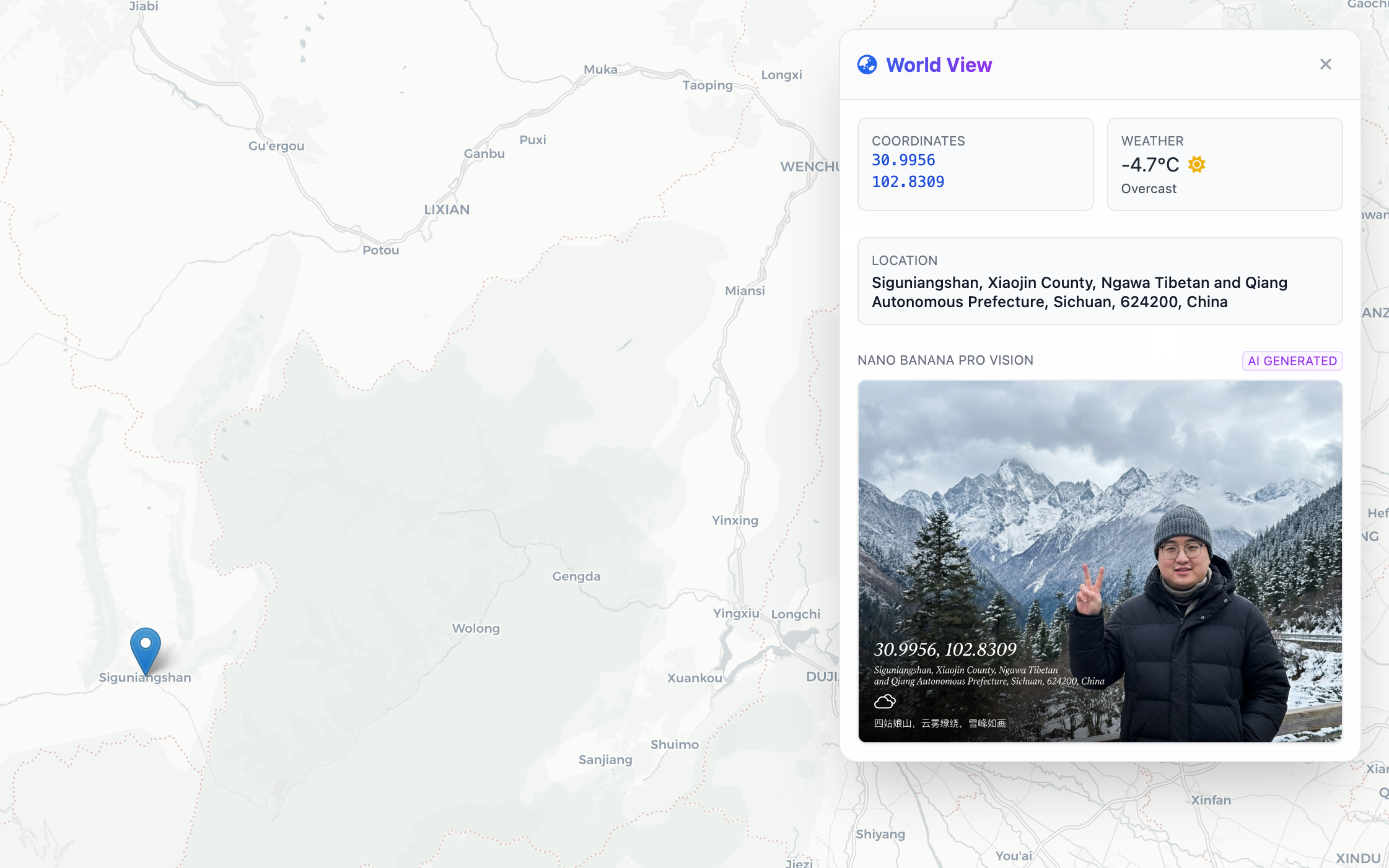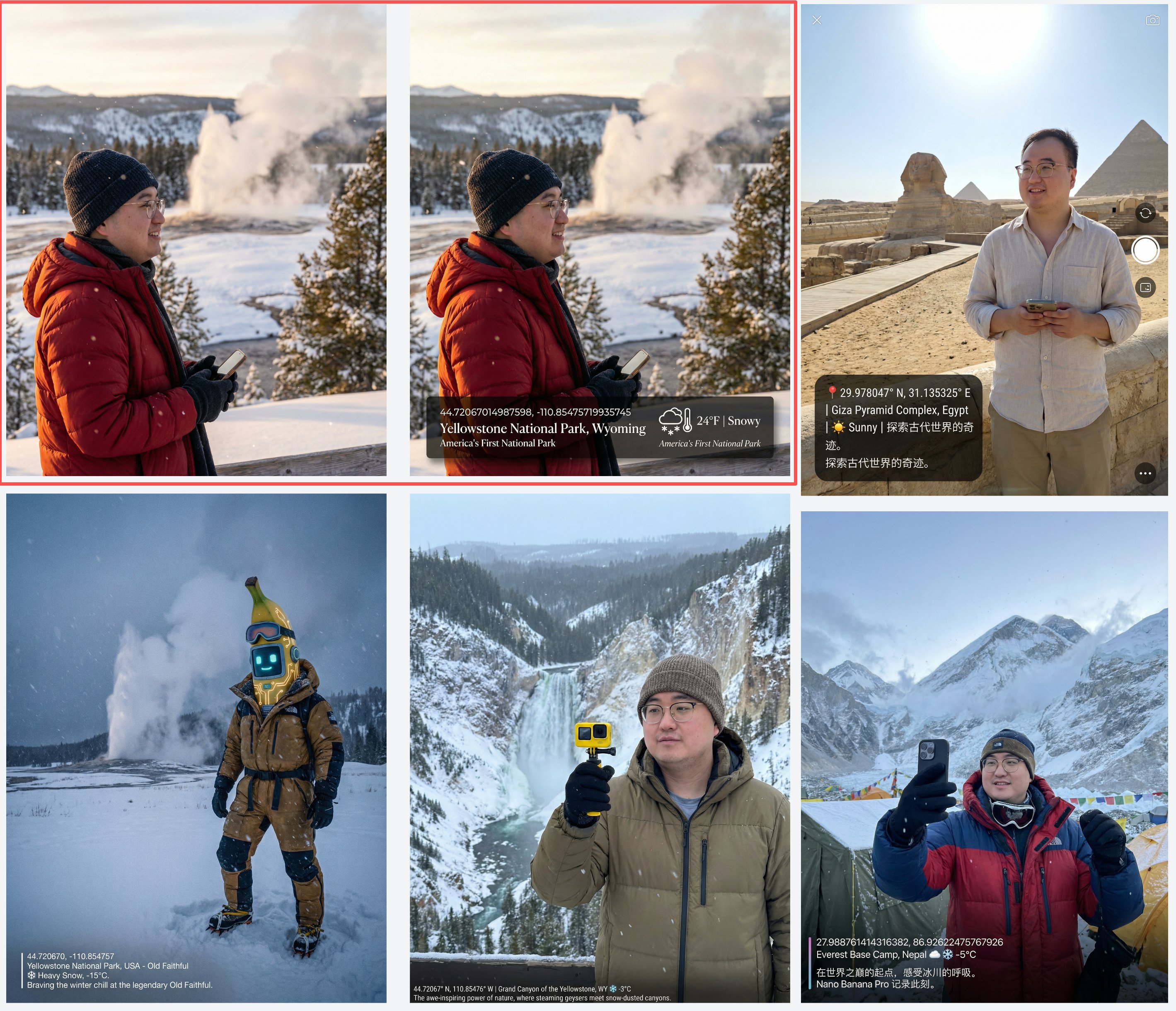 用 Nano Banana Pro 为这个人物创建一幅经纬度位于44.72067014987598, -110.85475719935745 并且符合当地当前时间氛围和实时天气的打卡照片,这个里边他的衣服穿着,需要根据所在地的这个风格去匹配。比如说雪山,它就是登山的衣服。比如说在都市里,它就是比较休闲的衣服, 在照片左下角用优美的排版写上当前经纬度以及位置信息和天气图标,并加上一句位置介绍文案。