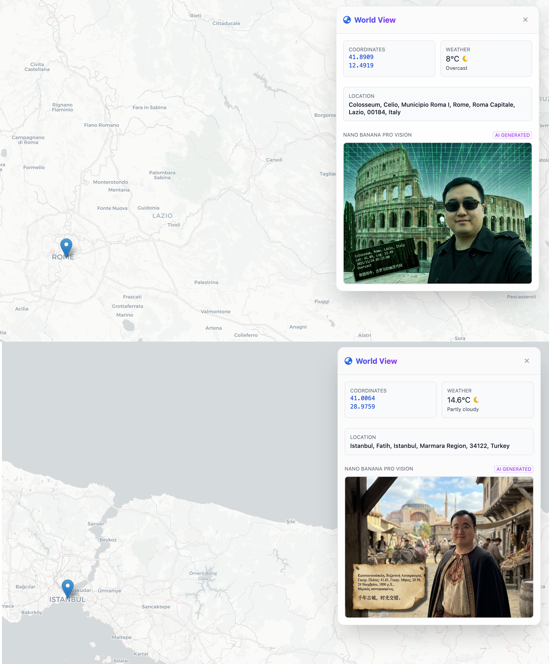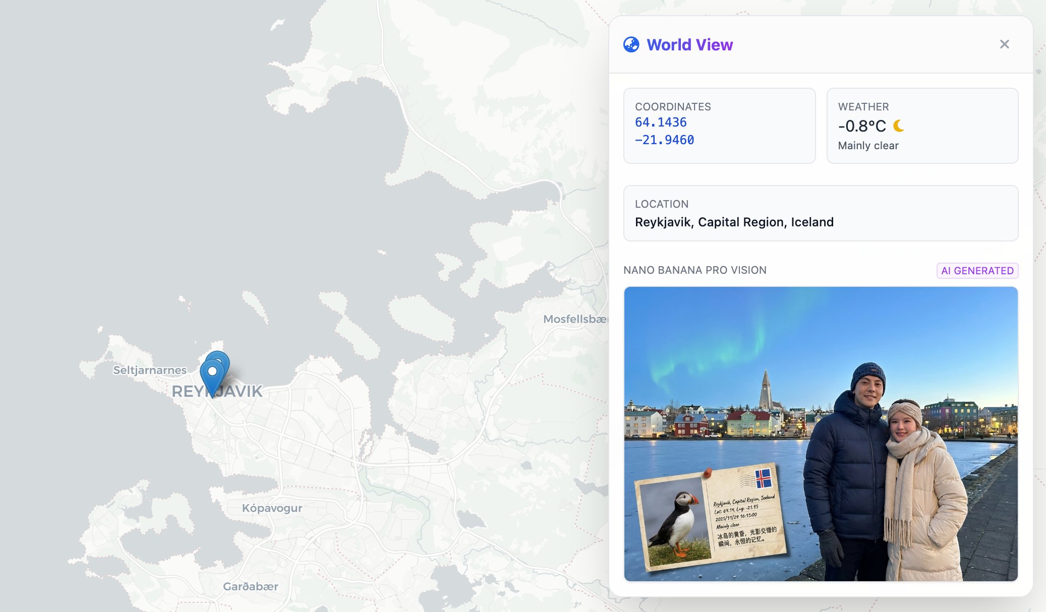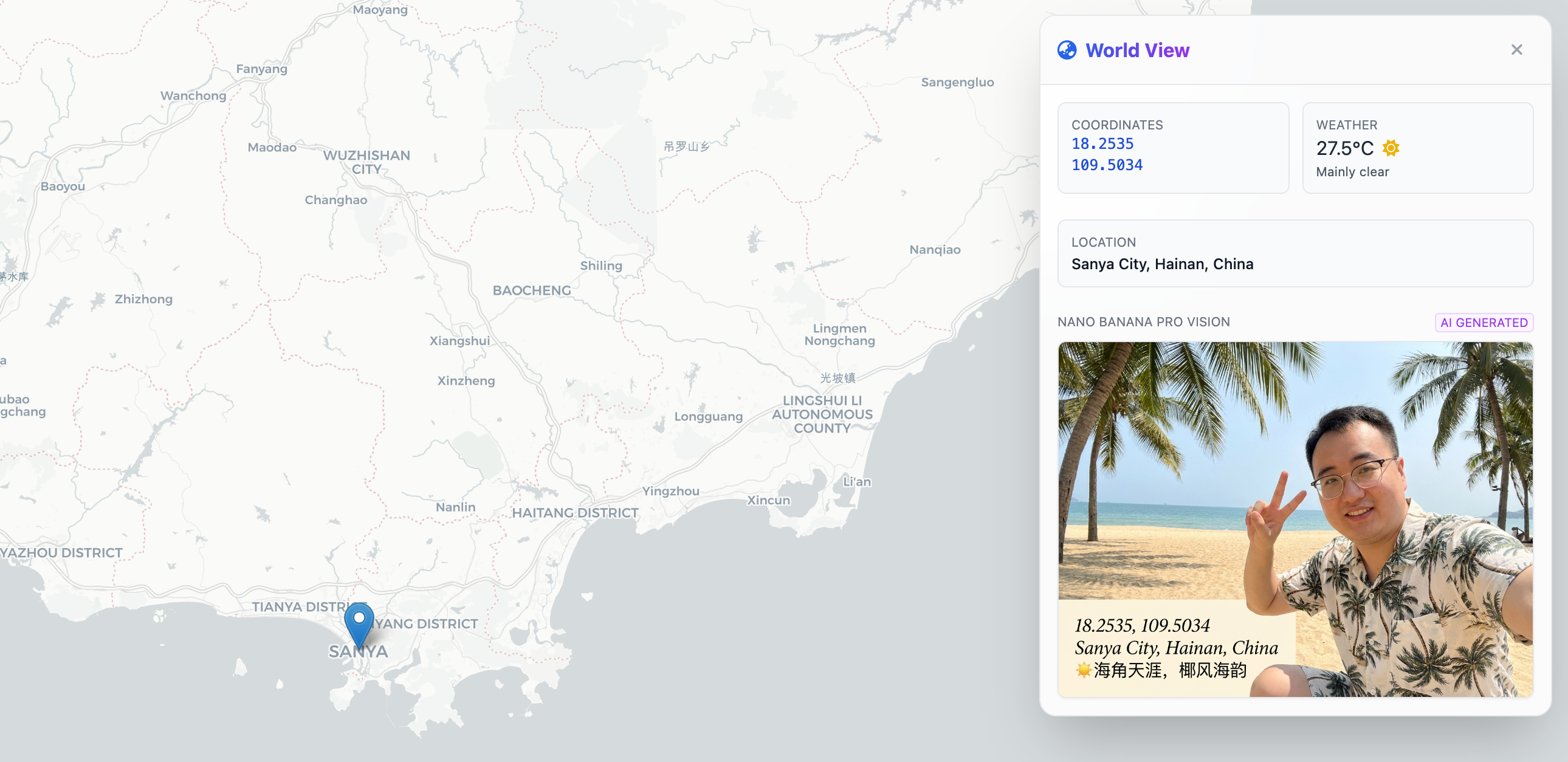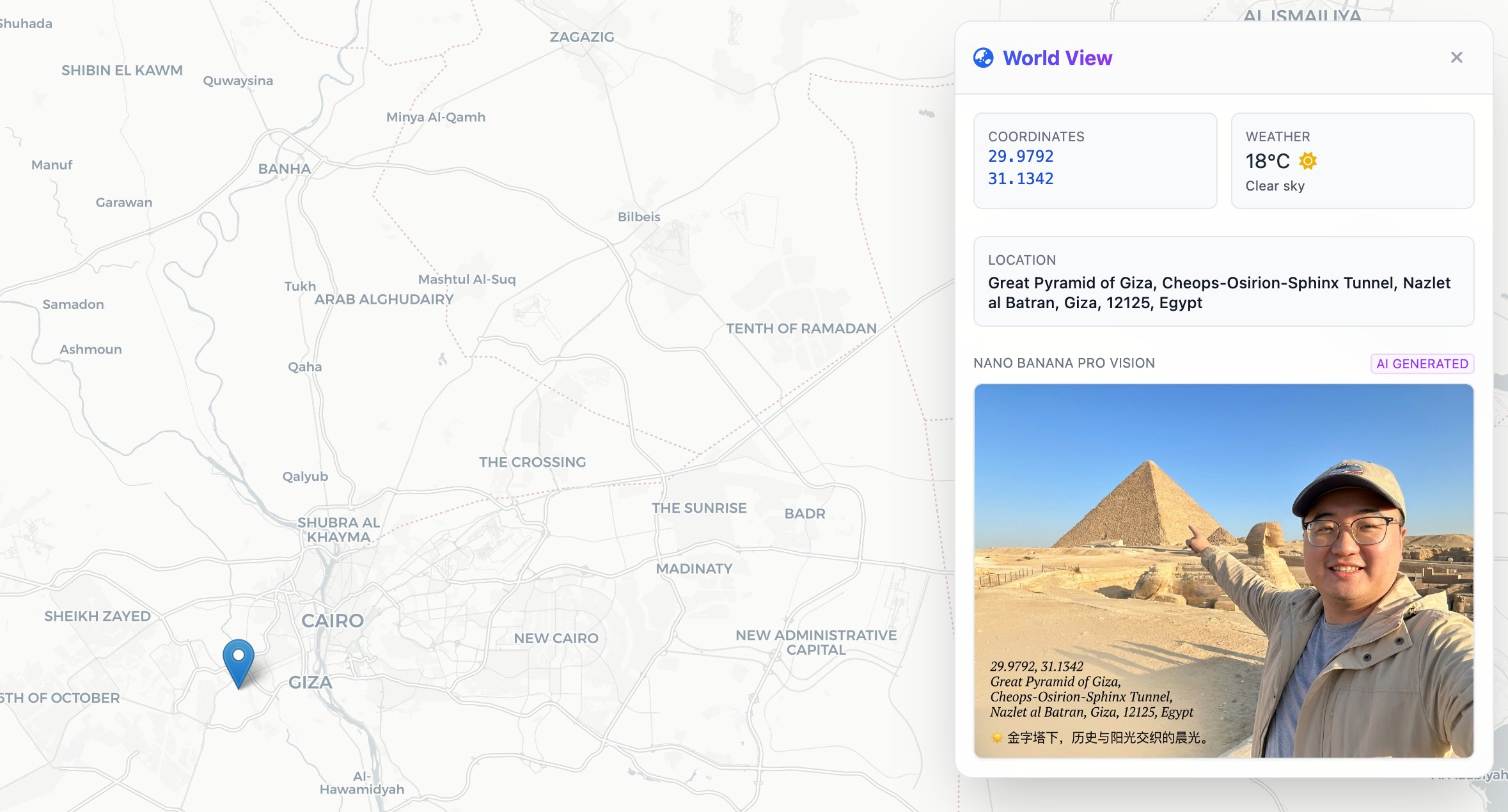 接下来的案例也很有意思,由于 Nano Banana Pro 有检索实时信息的能力,所以他知道现在某个地方的具体位置、天气时间等信息。