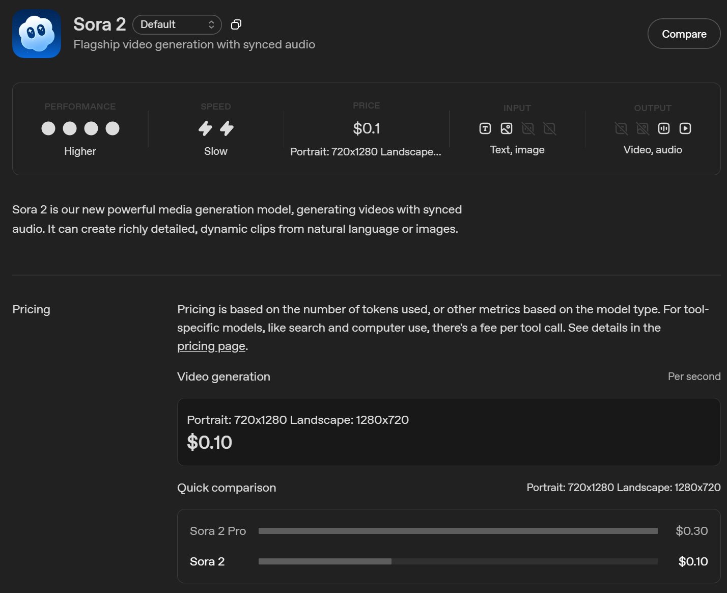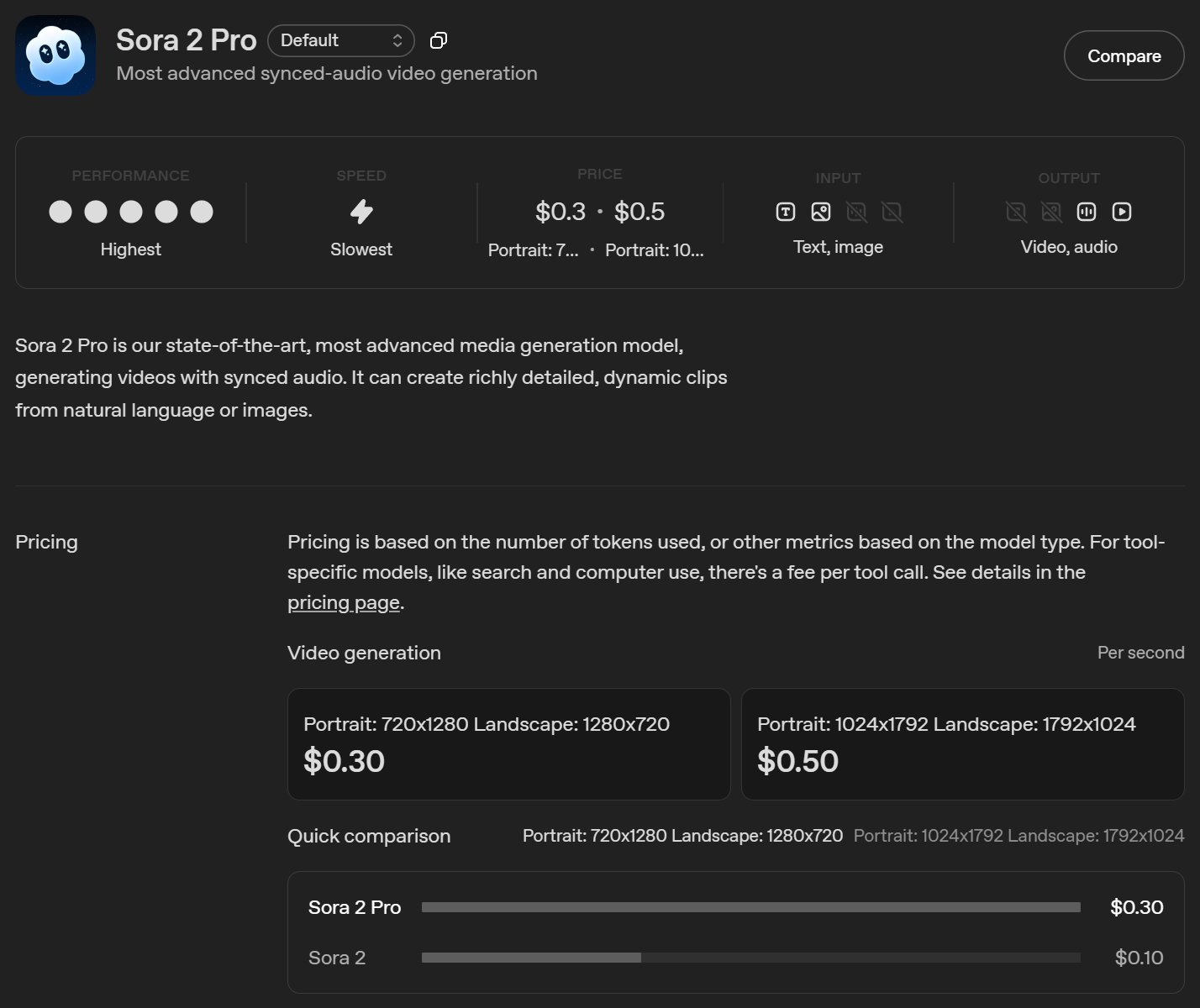 Sora 2 输出每秒 0.1 美元,Pro 输出每秒 0.3 美元
