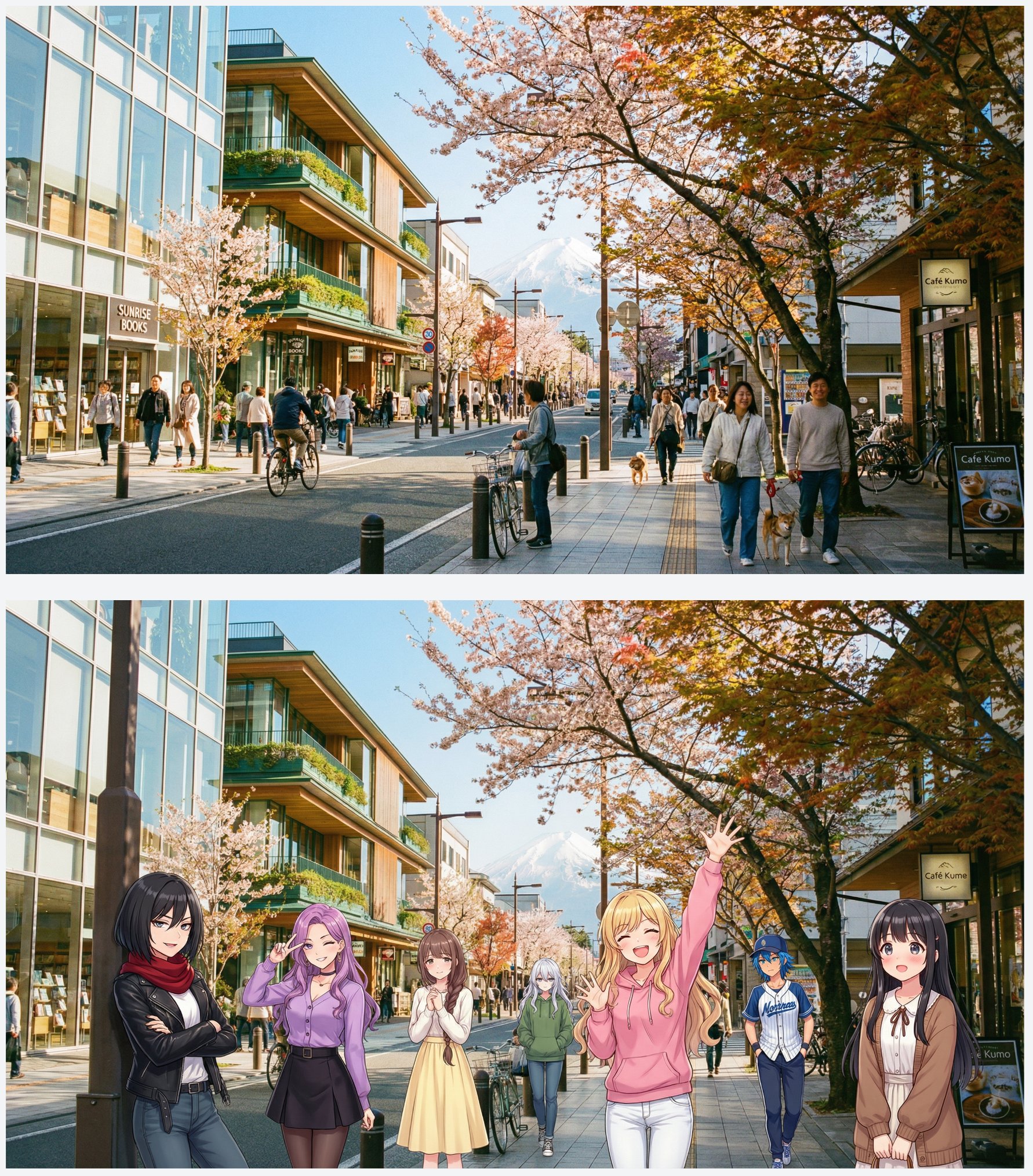首先是将动漫角色跟写实场景结合,而且是多个角色,看起来视觉冲击力很强,好像你的纸片人老婆出来见你了。