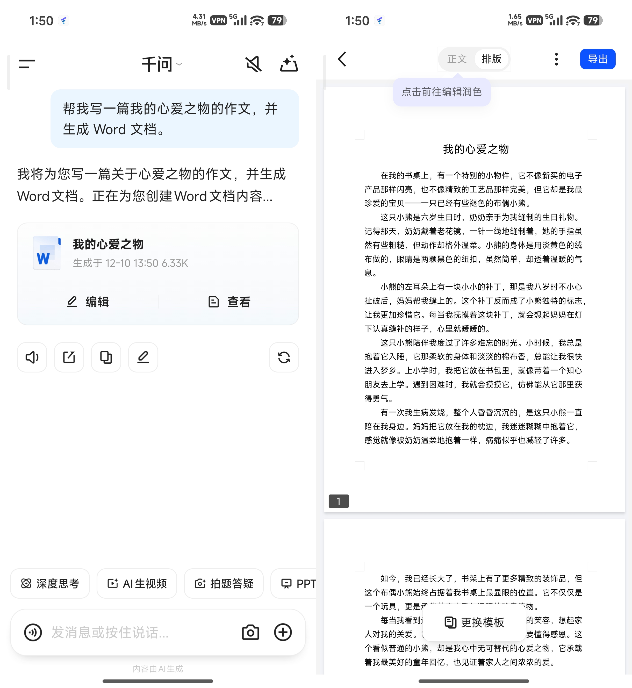 AI写作是对话即成稿。不用打开Office软件,直接跟千问说需求,自动生成智能排版的Word文档。论文和合同这种对格式有要求的还有几十万份模板可以适配,还有智能编辑器支持局部润色、全文优化、风格调整。