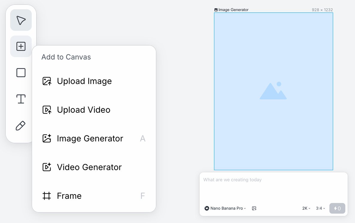 首先最稳妥的是在画布里面使用,先在左侧浮窗里面找到 Image Generator 这个选项,然后点击之后画布上就会出现一个图片生成区域下方有具体的设置界面,然后正常输入提示词使用就行。