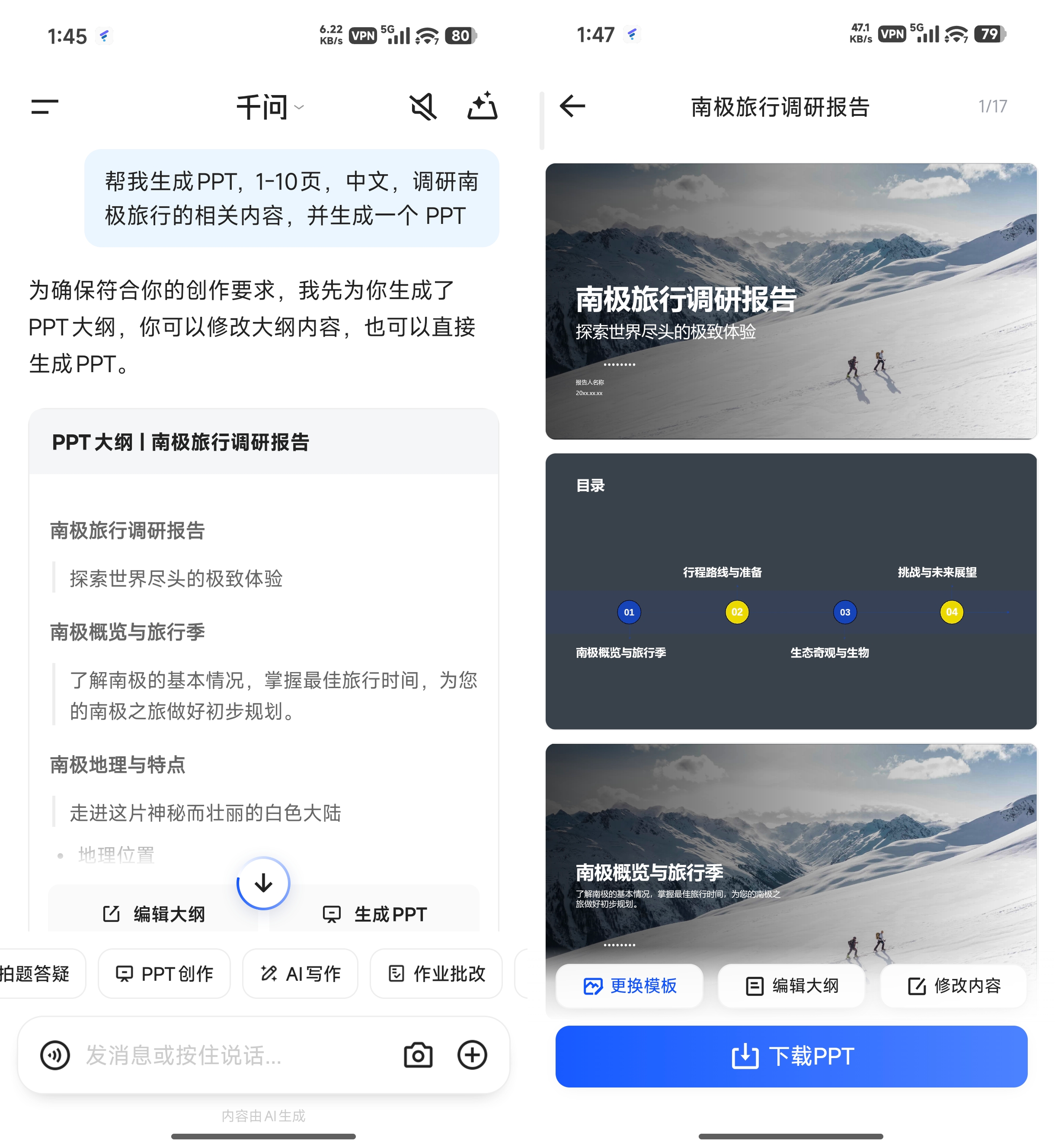 AI PPT是真的一站式。一句话、一张图、一份文档都能生成PPT,生成后还能对话修改。传统流程是先用AI生成内容,再复制到PPT软件里排版,来回折腾。千问直接在对话里搞定一切,最后导出成品,这里我搞了一个南极旅行计划 PPT。