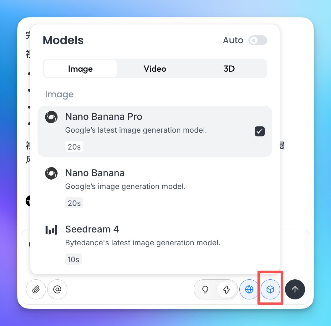 然后就是他们现在支持 @ 指定模型了。你可以在右侧 Agent 的输入框 @ Nano Banana Pro 这模型后面跟上提示词来只使用对应模型。