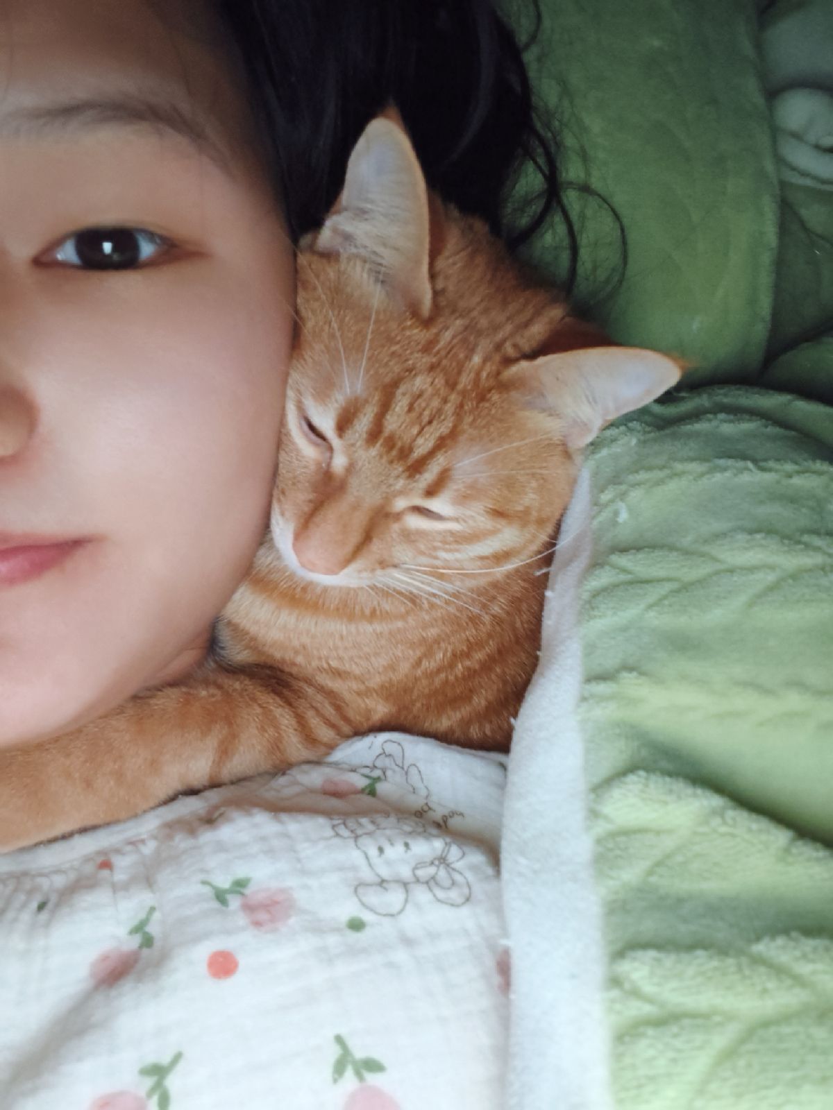 醒了,猫也醒了,但是谁都不想起床,我俩就这样挨着头,一起看手机。