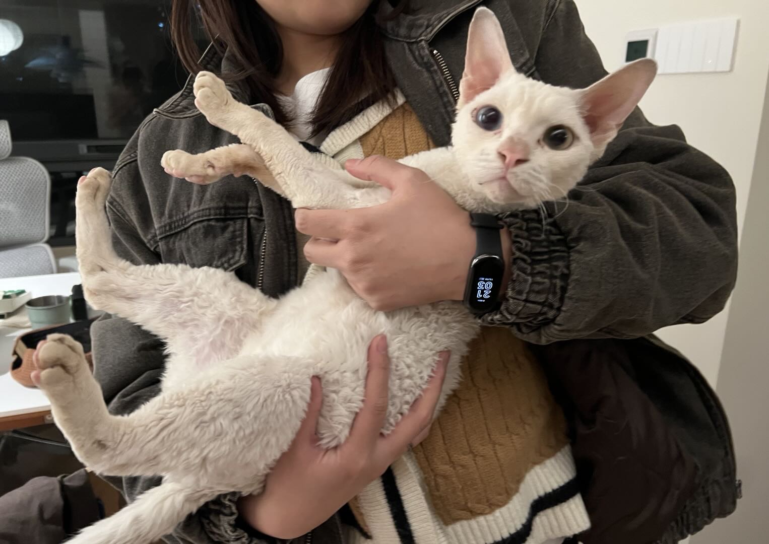 山久久: 上周在小区里救了只流浪德文(是的这年头德文都流浪了),同城蹲领养,随时 dd 我。 1.5-2 岁,异瞳,已抽血检查无疾病,已驱虫,已洗澡。