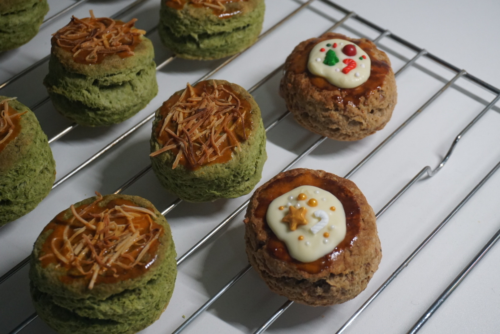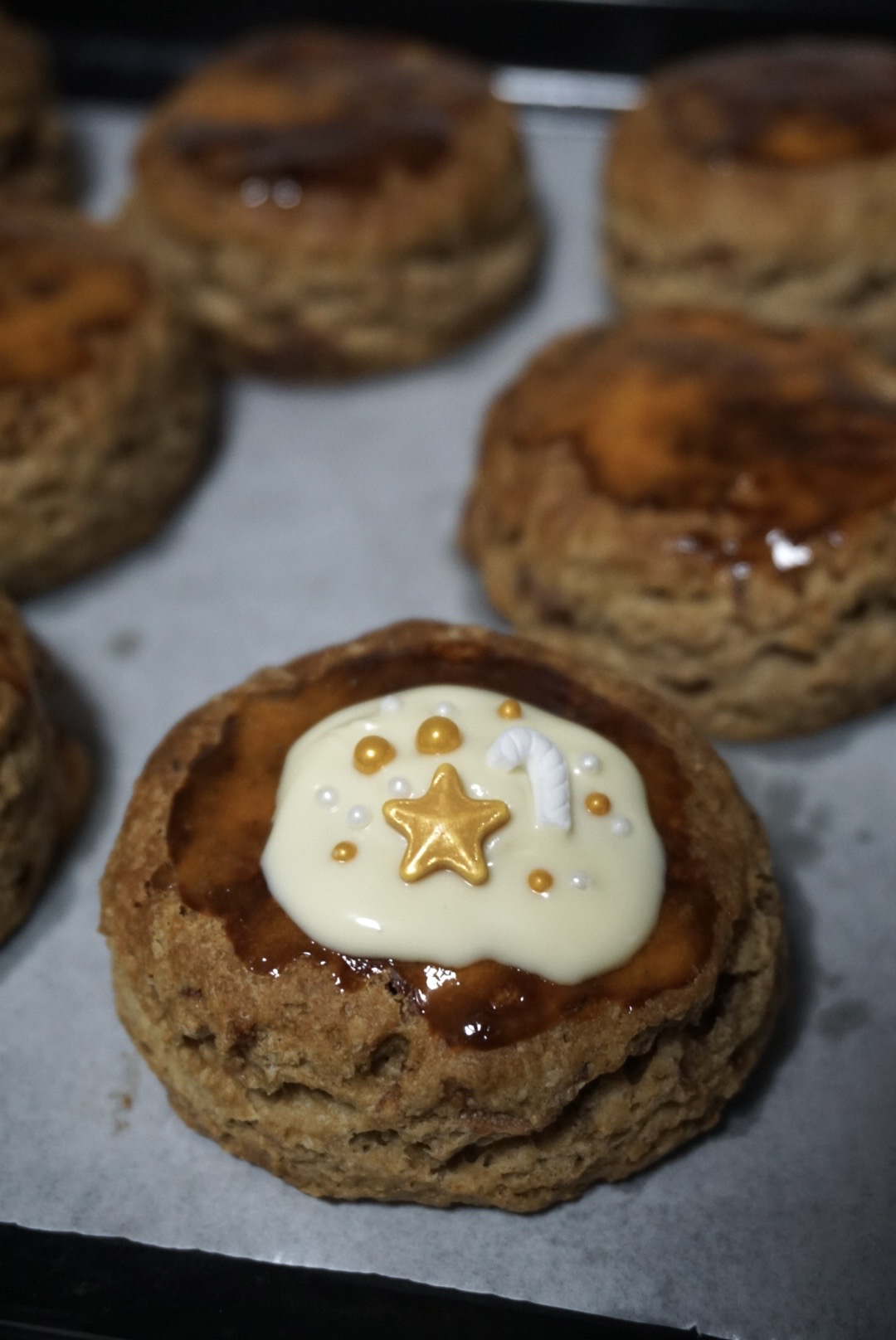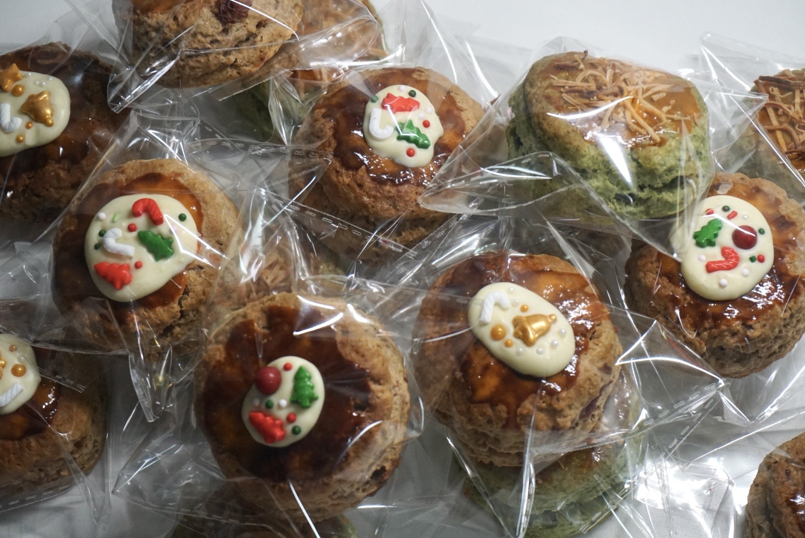 一年揉一次司康,一次站一天厨房…皱着眉折腾圣诞糖珠命里有这一次就够了。打包的时候发现丝带没买够早早用完,也不想补了,烘焙的额度和剩下的包装纸都留给明年。