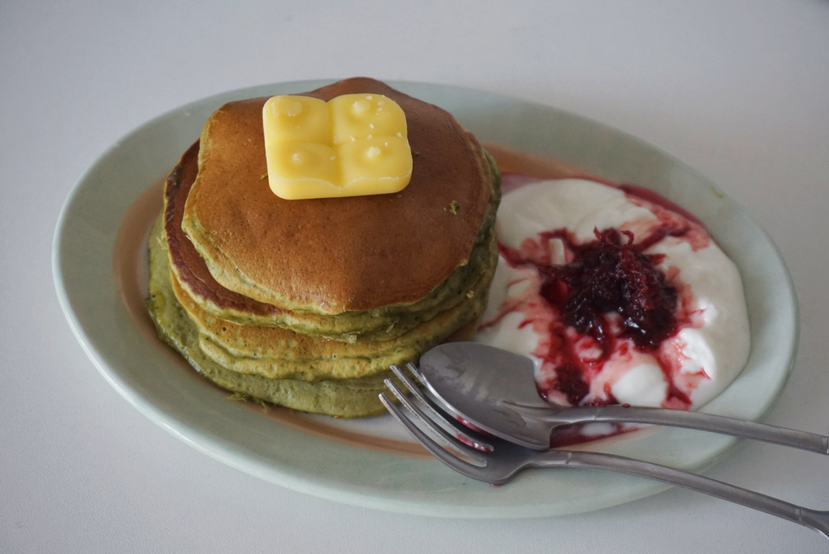 60g面粉的量摊了四张饼,对自己而言还是稍多,配上无糖酸奶和玫瑰酱一起吃。