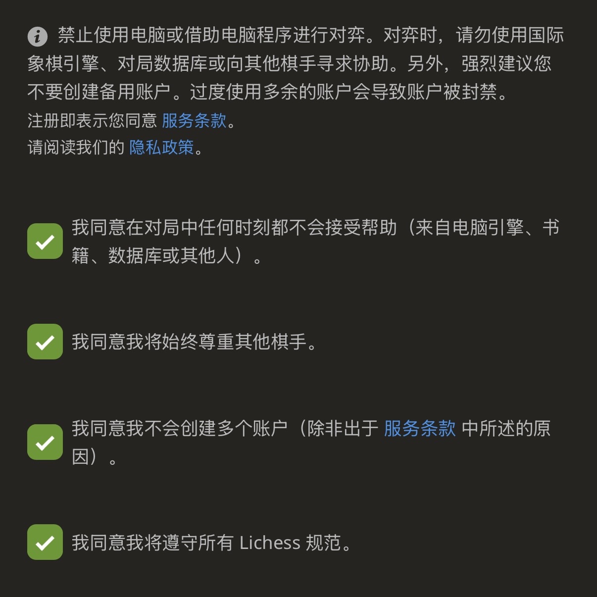 第一次见到用户注册时需要勾选的选项里包含「我同意我将始终尊重其他棋手」。
