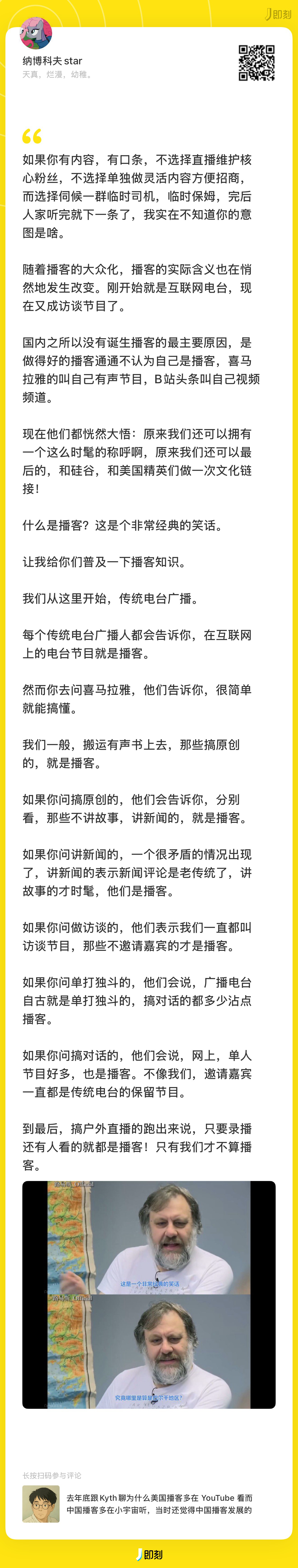 「现在播客在美国互联网上,更多上是指一种人与人之间的对话,会被拍下来,大家拿着话筒,有几个机位的一种秀。至于这种秀放在哪里,是不是首发在传统的播客渠道,其实悄悄地已经在发生一些变化了。」