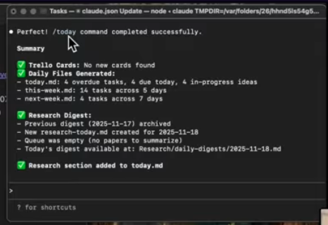 - 自定义指令(Slash Commands):她在 Claude Code 里定义了一个 /today 指令。每天早上敲一下,AI 会执行一段 Python 脚本,自动去搜寻所有 Markdown 文件的「元数据」(YAML 前缀),把今天到期的、逾期的、以及正在进行的长期 Idea 汇总成一个新的