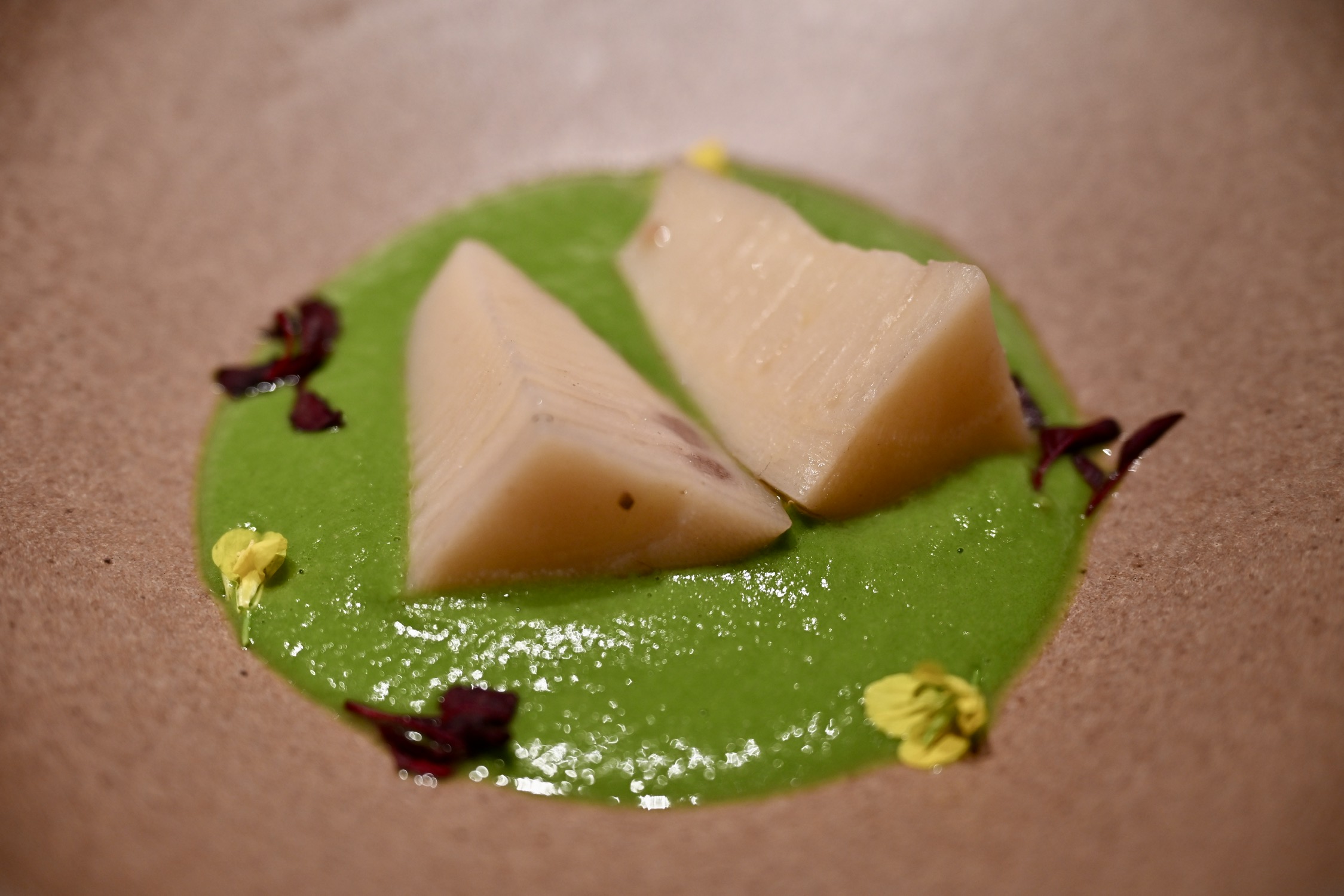 米酿冬笋,低温慢煮的冬笋脆嫩,没有丝毫纤维感,搭配酱汁食用,便在鲜甜之上覆着开心果的坚果香,这是我老婆的全场最佳。