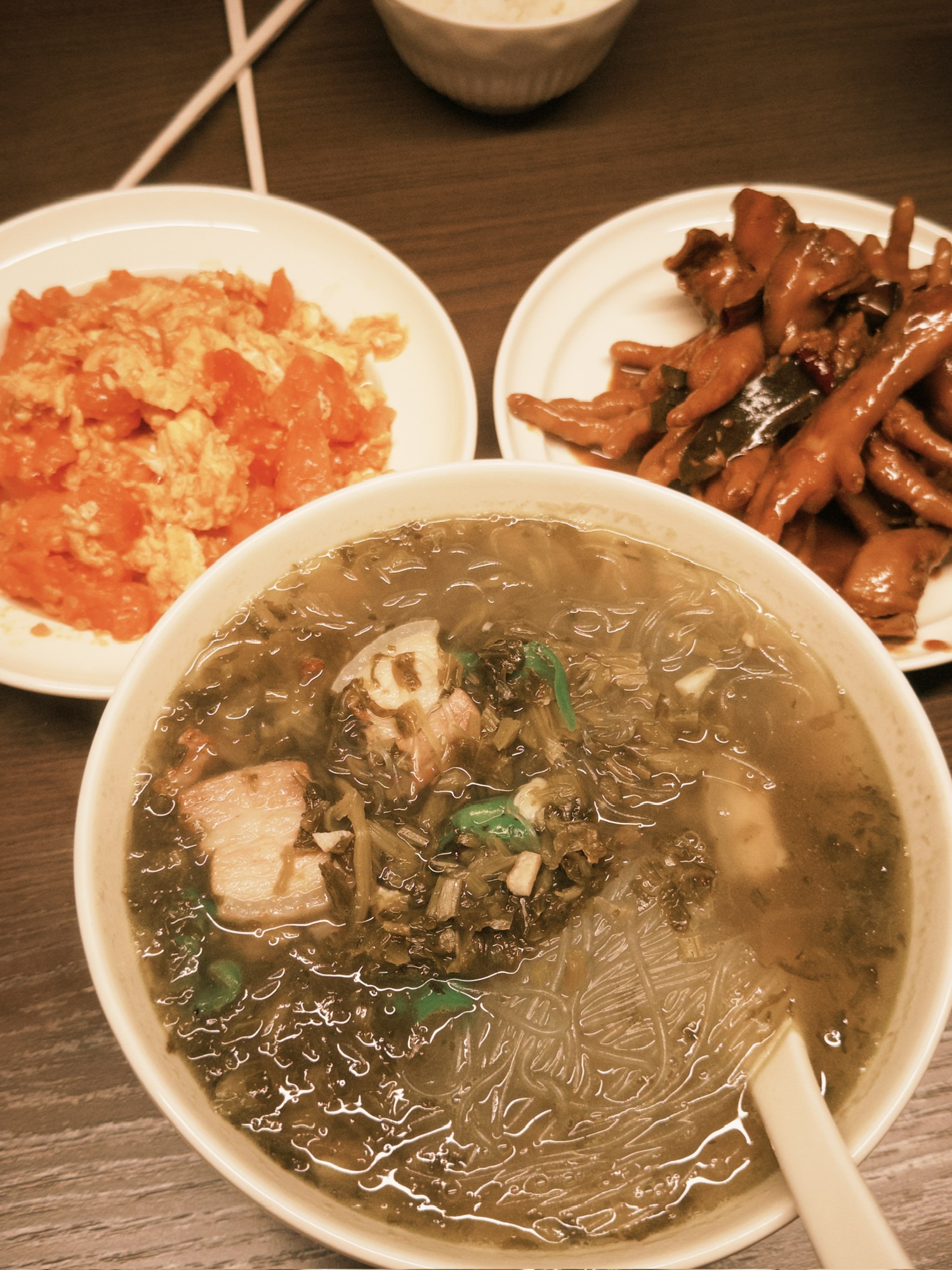 今天晚饭吃了3个鸡爪,4勺番茄鸡蛋,一碗装满肉片和粉丝的汤。