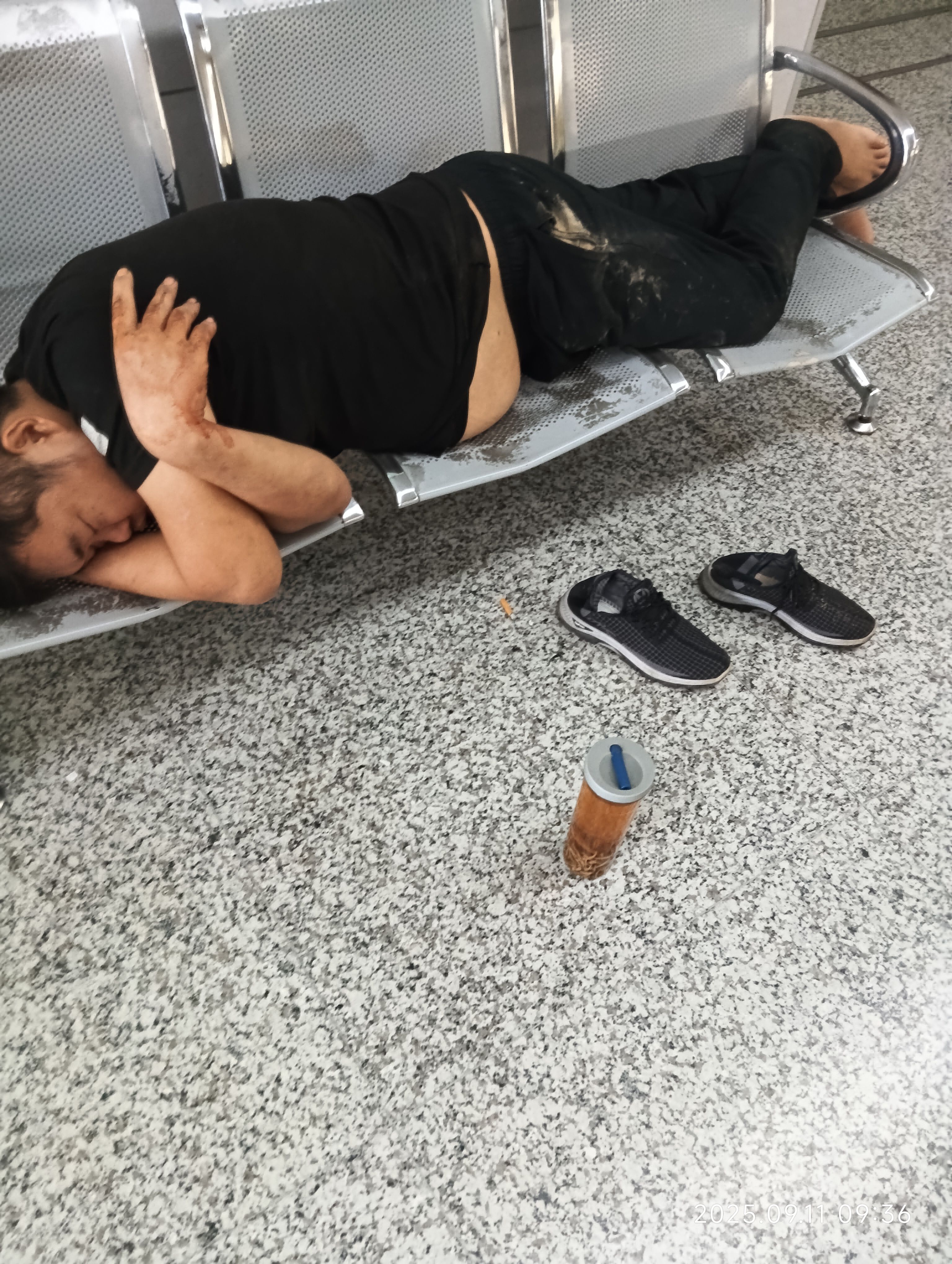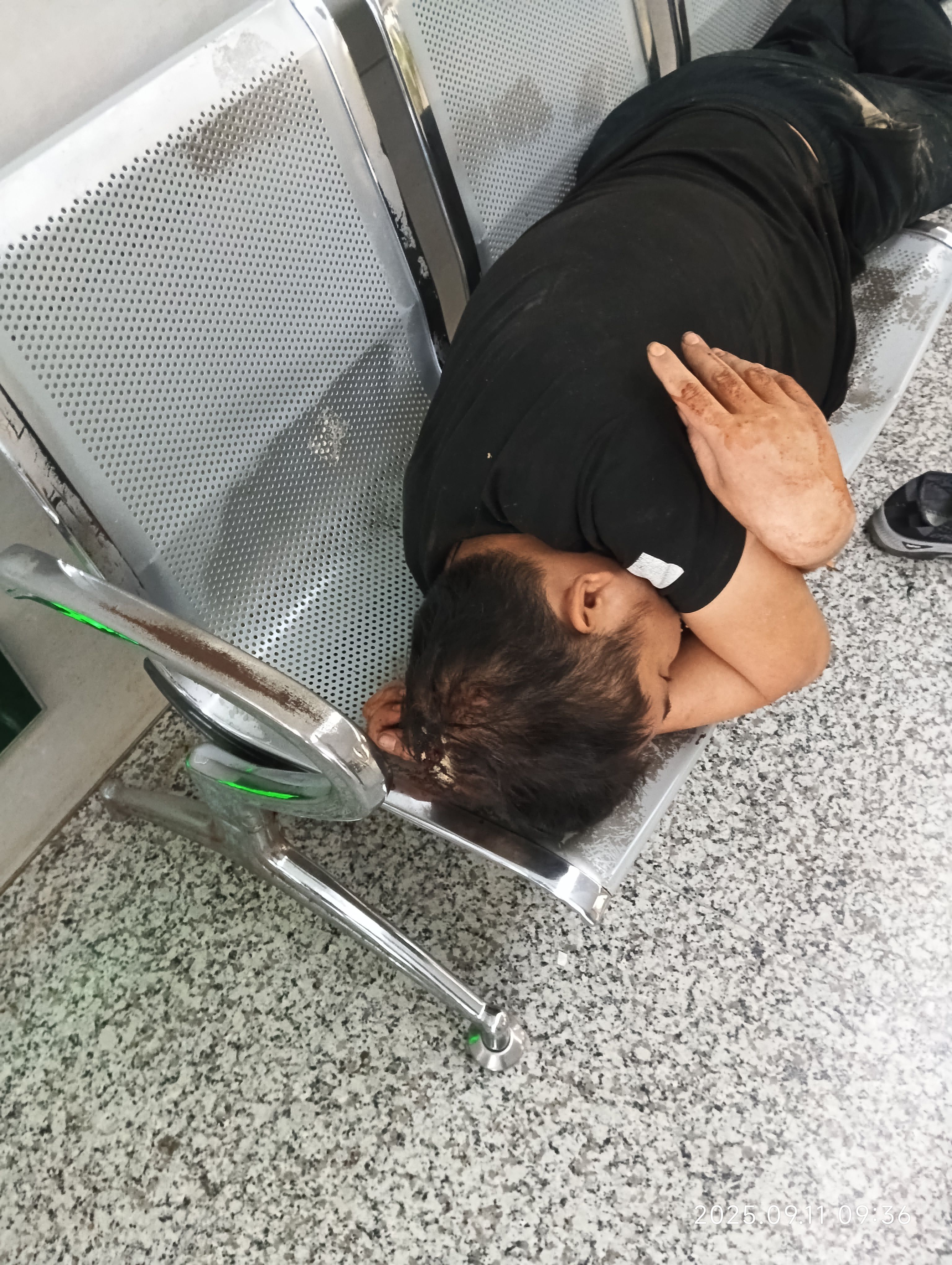 蜷在铁椅子上据说至少5个小时了