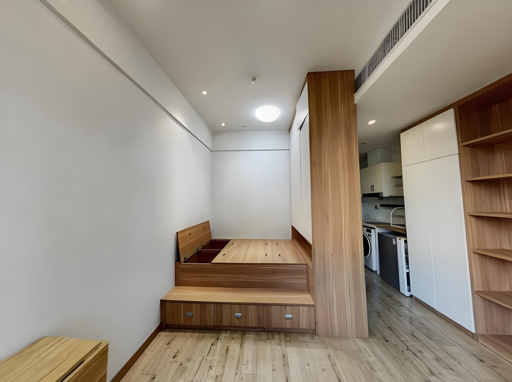 - 自己之前也找室内设计师全屋装修过,目之所及的书桌、各类柜子等都是自己选的原木,根据自住的标准和需求,空间做了很多隐藏式收纳,所以小空间可以显得开阔不少。
