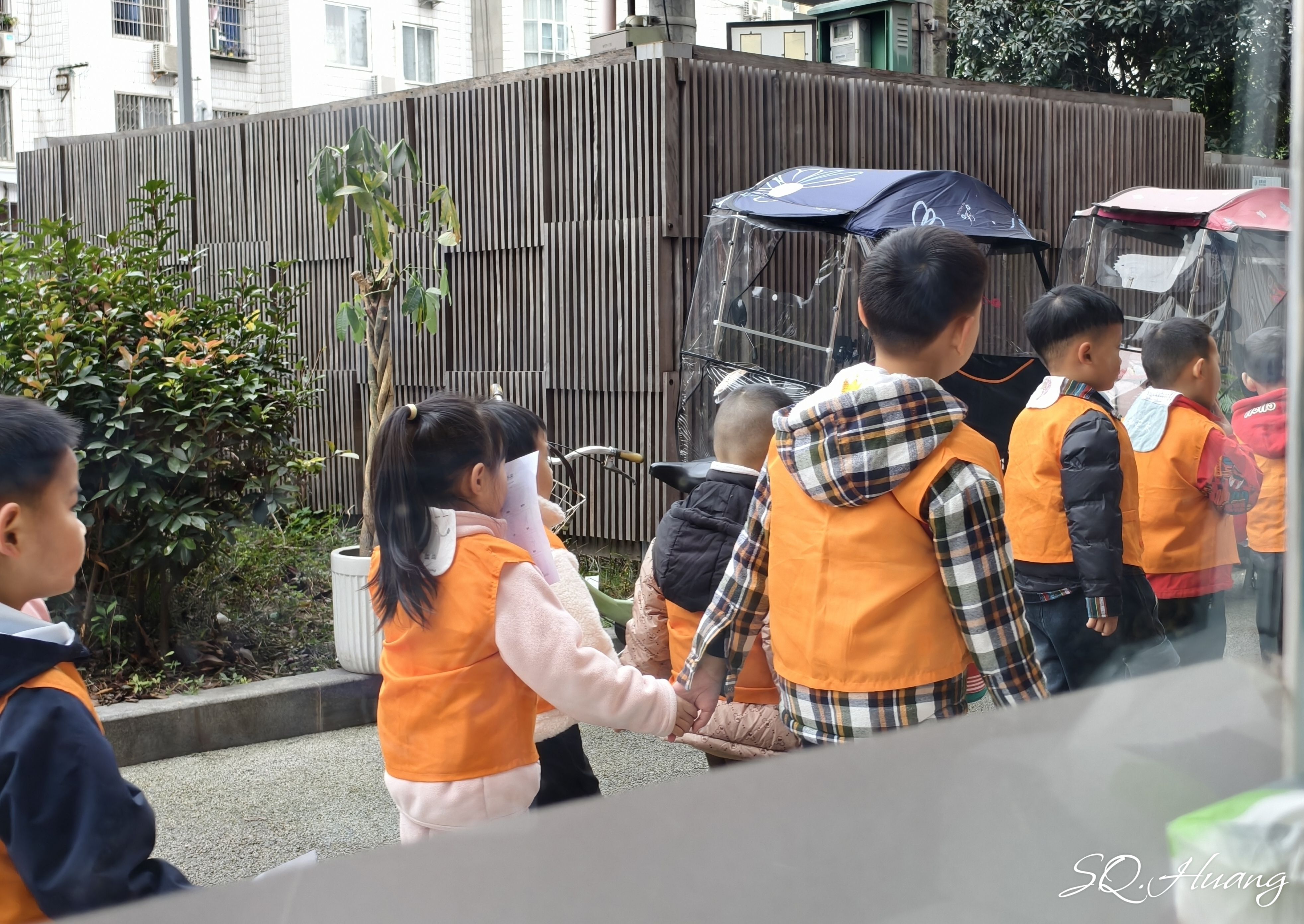 2. 窗外有群幼儿园小娃娃秋游回来了