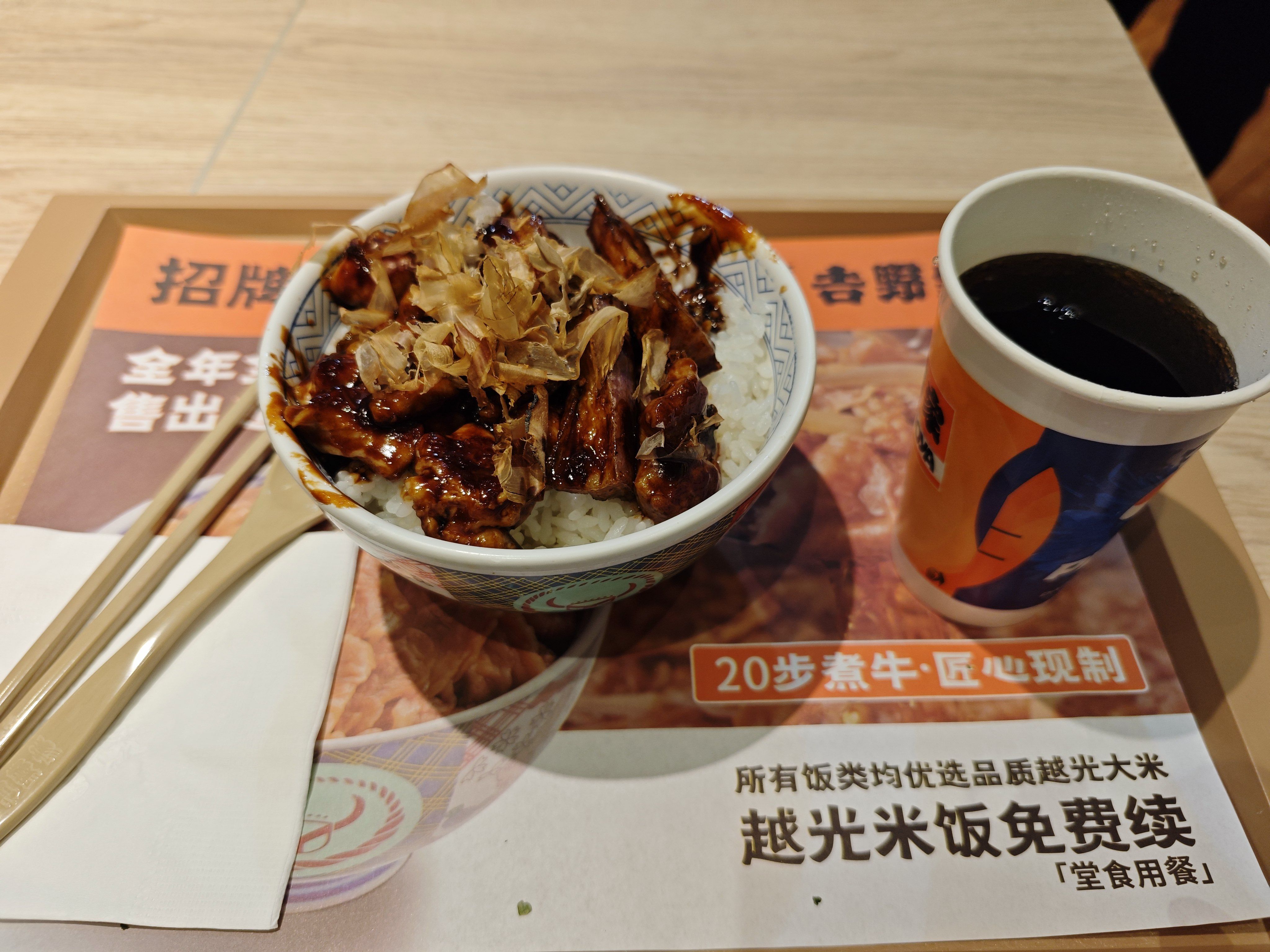 头一回吃吉野家,别看碗小,挺深的,一碗饭够吃了,他家好像是现做的,这一小点盖浇我等好半天。15块钱套餐饮料免费续,以后夏天就来这了,还知道了wifi密码8个8