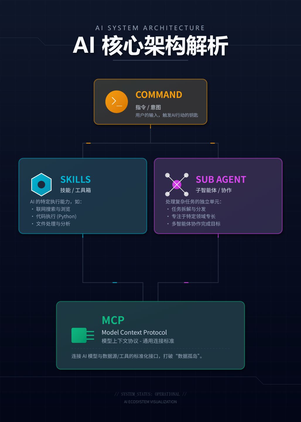 关于Skills (技能)、Command (指令)、Sub Agent (子智能体) 和 MCP (模型上下文协议) 四个核心概念理解