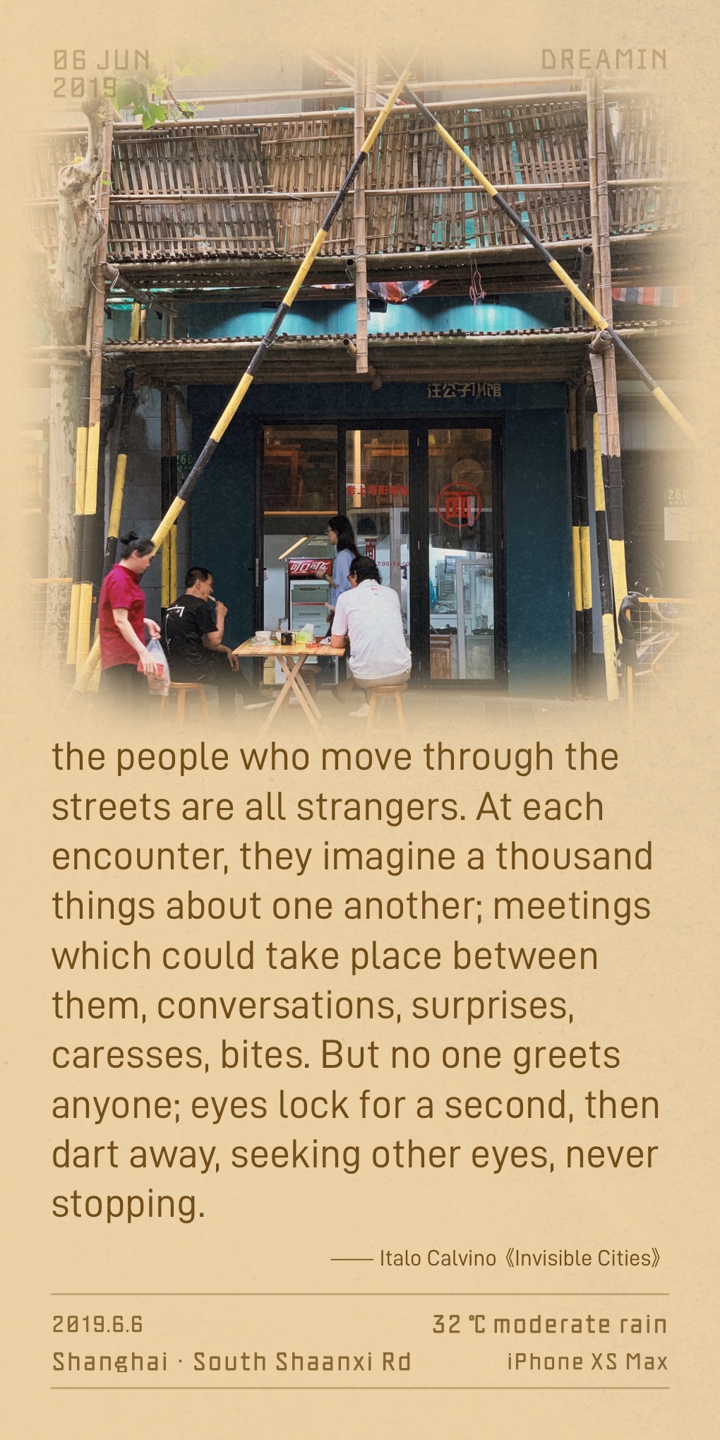 AI可能不知道这张平凡无奇的照片意味着什么。是第一次去上海看一个多月没见的男朋友,送他去公司上班,在吧台做了杯咖啡才离开。临走前,他老板推荐了几家咖啡。去完ops,慢慢溜达去odor 。那天风突然很大,梧桐的味道很浓,有点过敏。路过全家就买了口罩,走着走着拍下了这张。后来从北京搬去上海,也认识了很好的人。《看不见的城市》是这期间读的书。再后来,继续换城市,临走前这本书留给了一位朋友。这个朋友最近在做的产品,正好又把这个城市和这本书又推荐回来。
