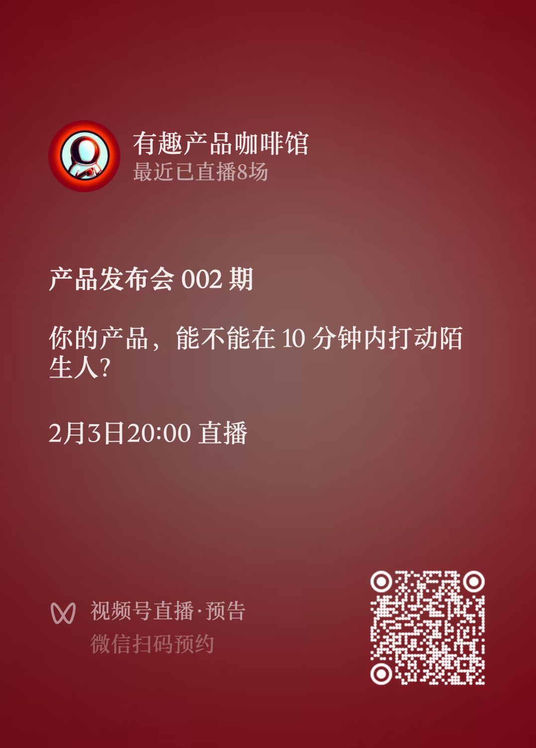 同时第二期产品发布会,在今晚就会开始,直播的渠道是视频号,「有趣产品咖啡馆」的视频号,就在今晚八点,到时候欢迎来围观或者参与发布你的产品😊