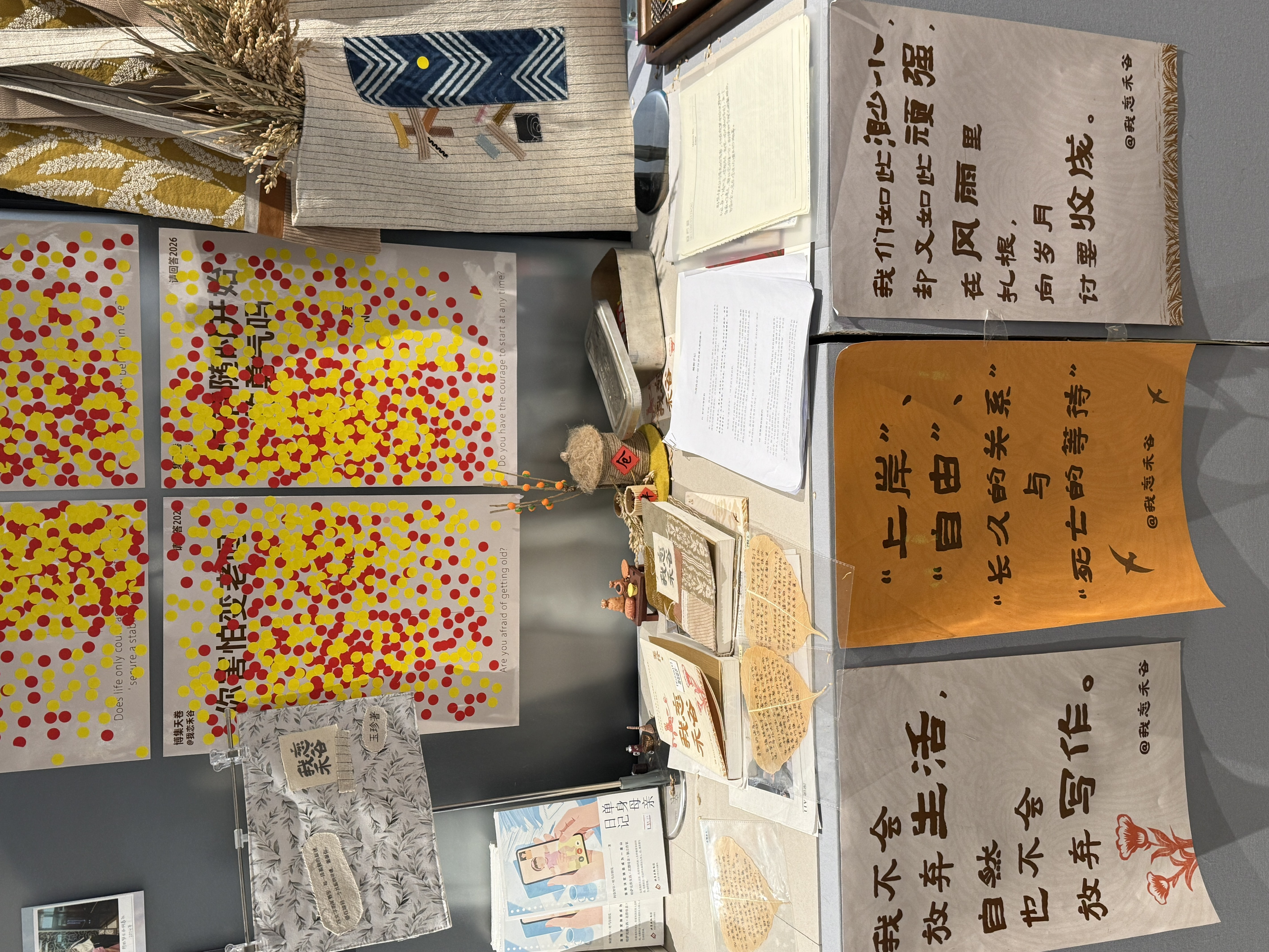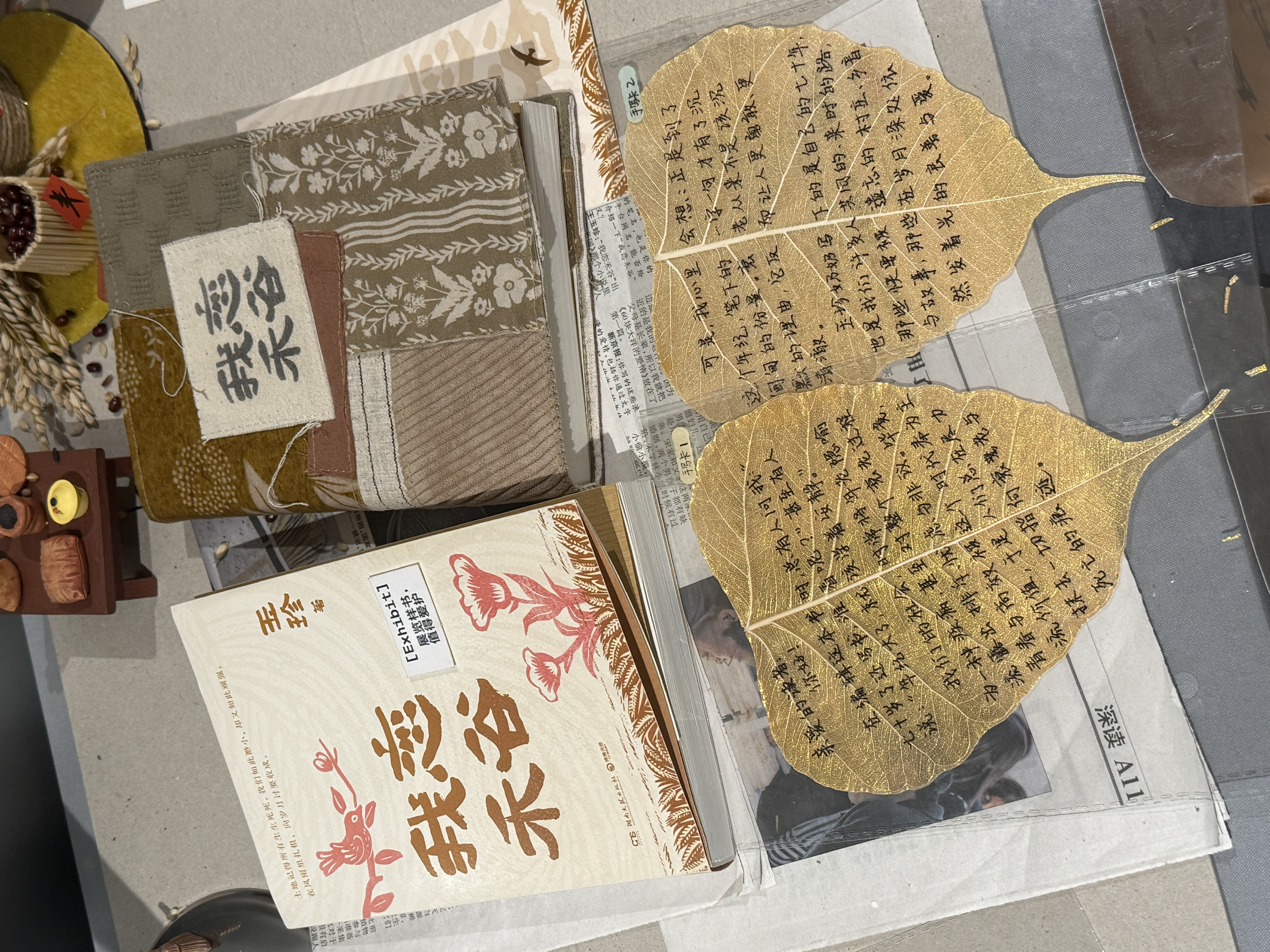 比如前三张图,《我恋禾谷》,围绕书里的意象,摆放了谷仓啊,柿子树啊,麦穗儿等等。对应的周边有帆布包,布艺书衣等等。作者和编辑的寄语写在金灿灿的树叶上,非常精致美好有氛围。
