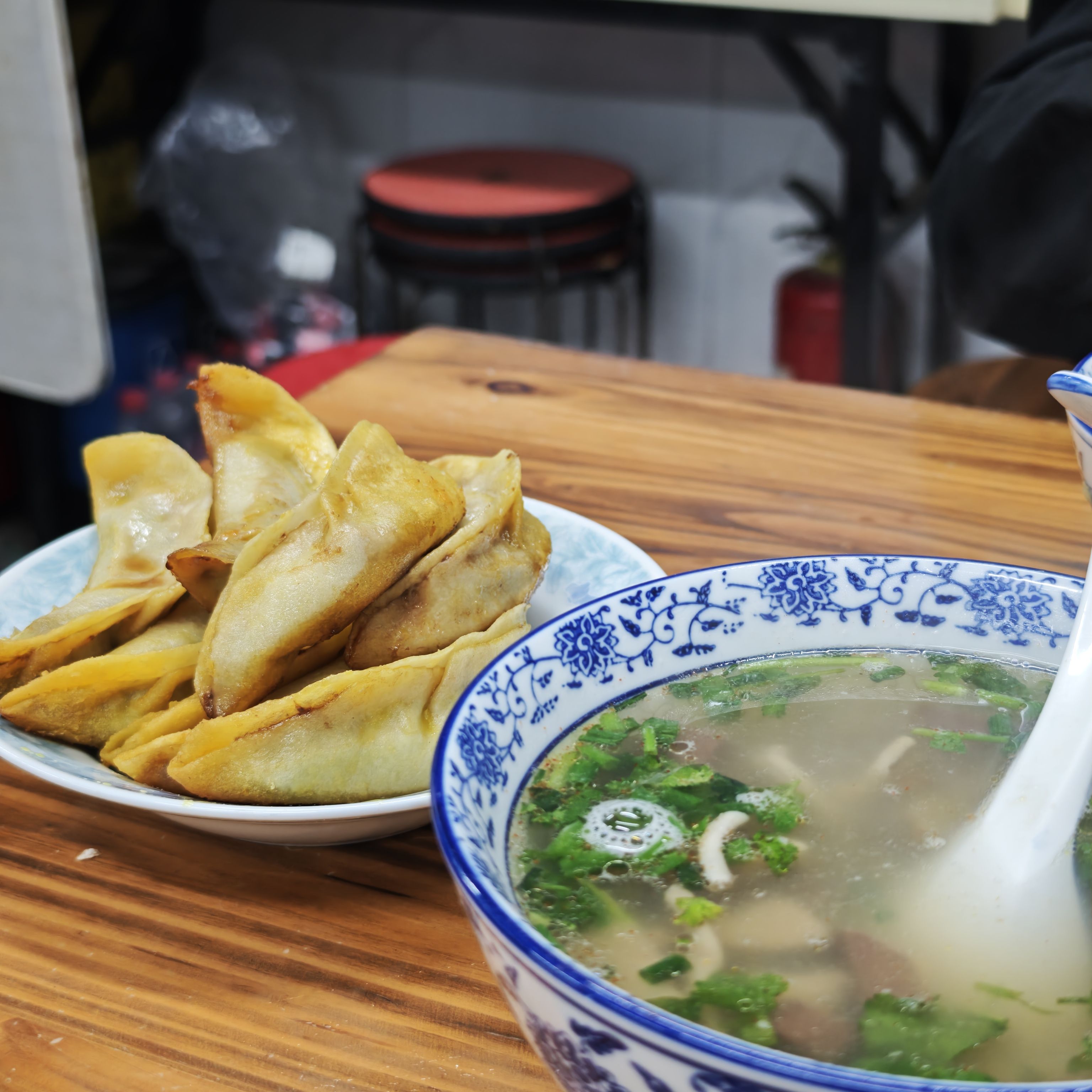(牛肉锅贴,鸭血粉丝汤)