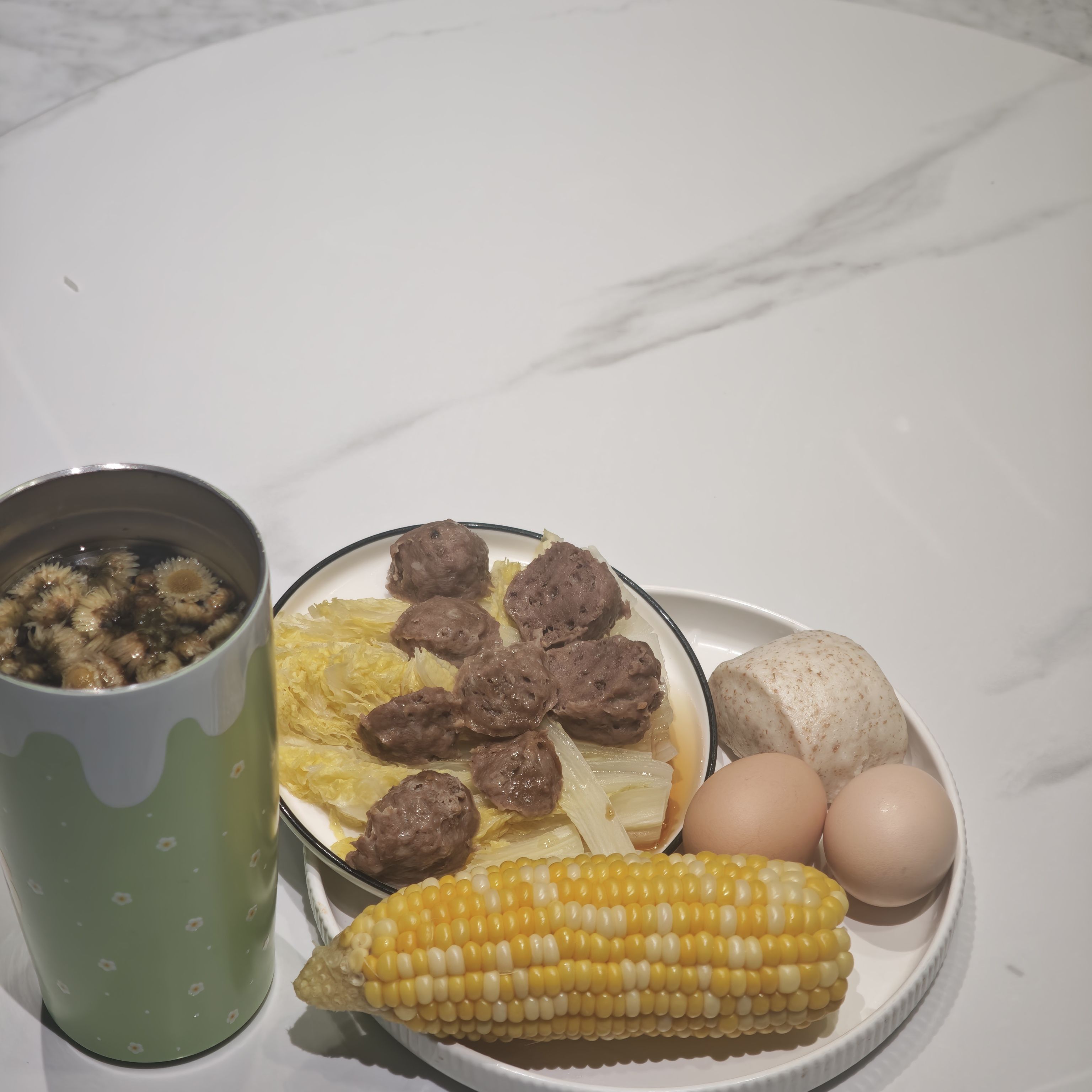 (菊花茶,娃娃菜蒸牛肉丸,鸡蛋🥚,小馒头,玉米🌽)