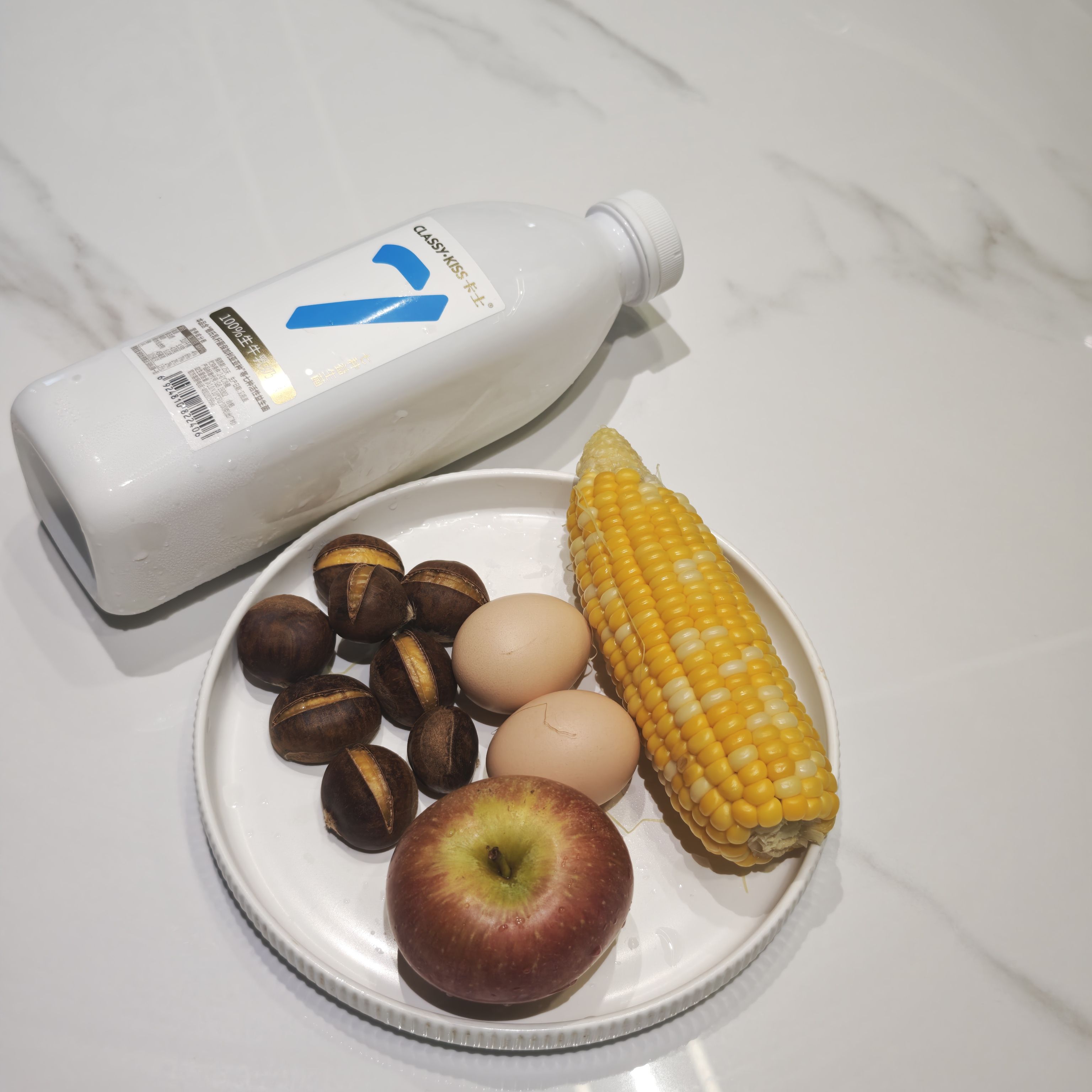 (无糖酸奶🥛,玉米🌽,鸡蛋🥚,苹果🍎,板栗🌰)
