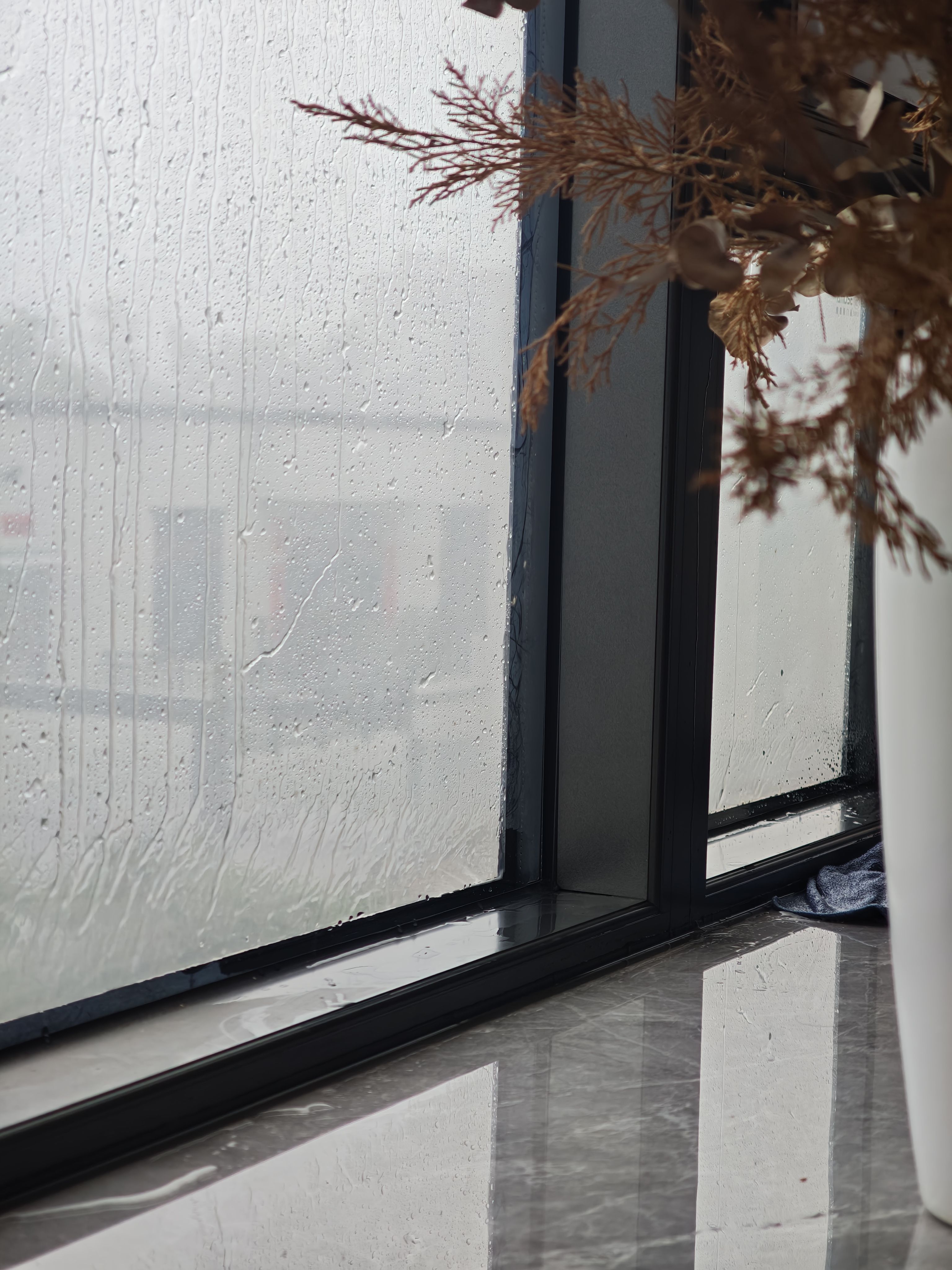 家里每个窗户都水浸。一直在擦水。