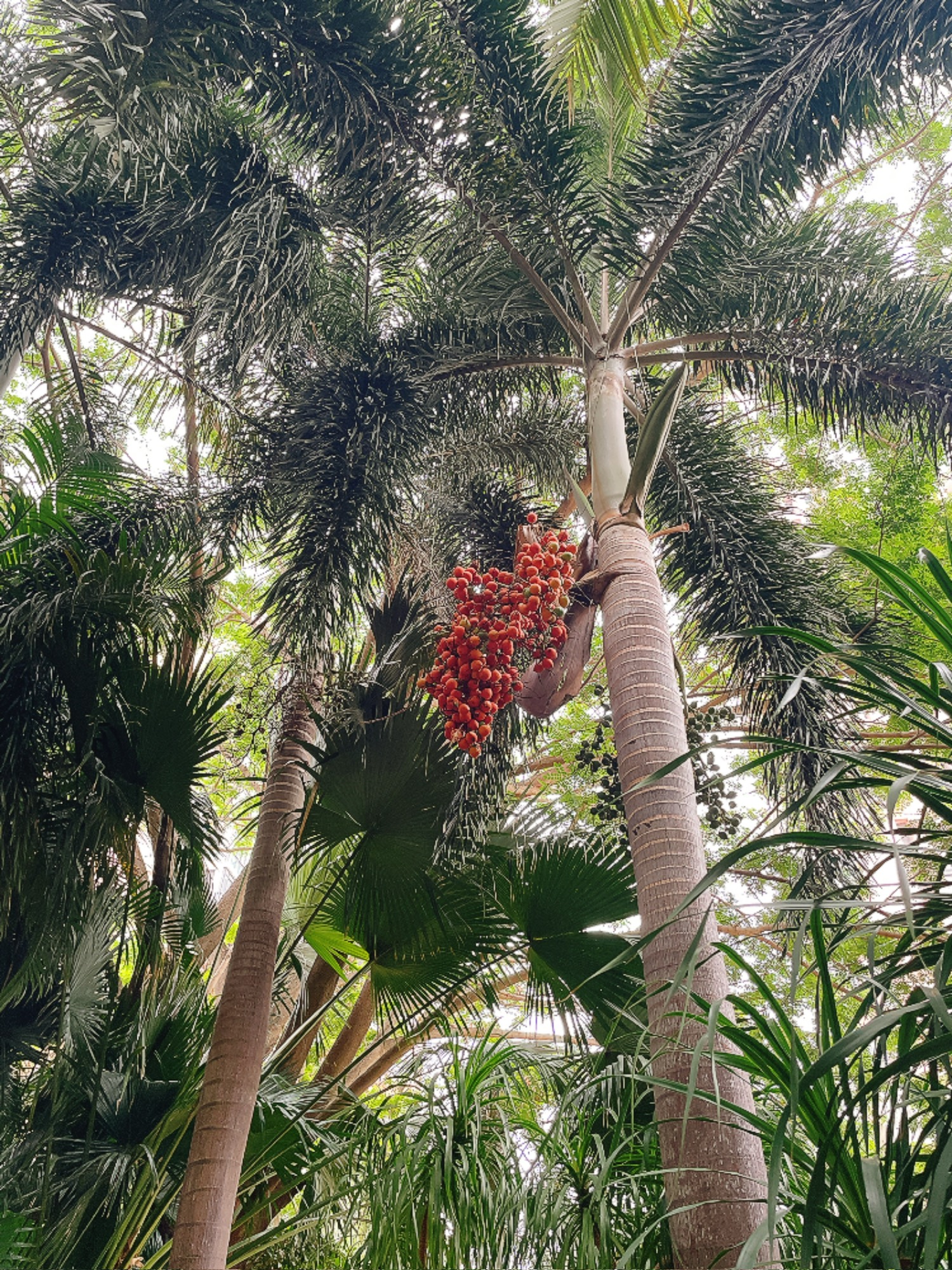 狐尾椰结果了,上面有个花苞,果实不能食用,有人拿核当文玩盘,叫千丝菩提