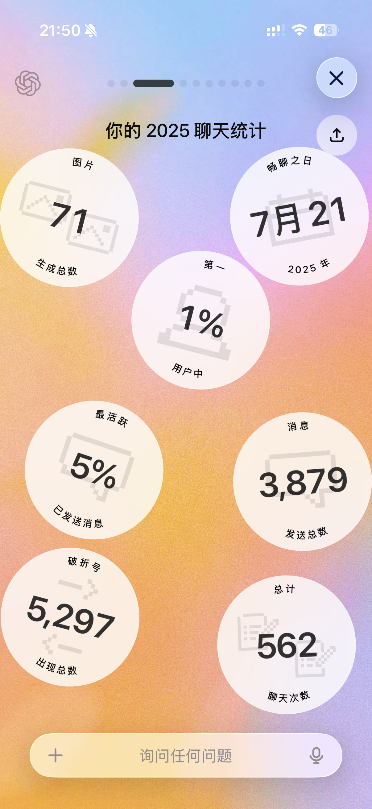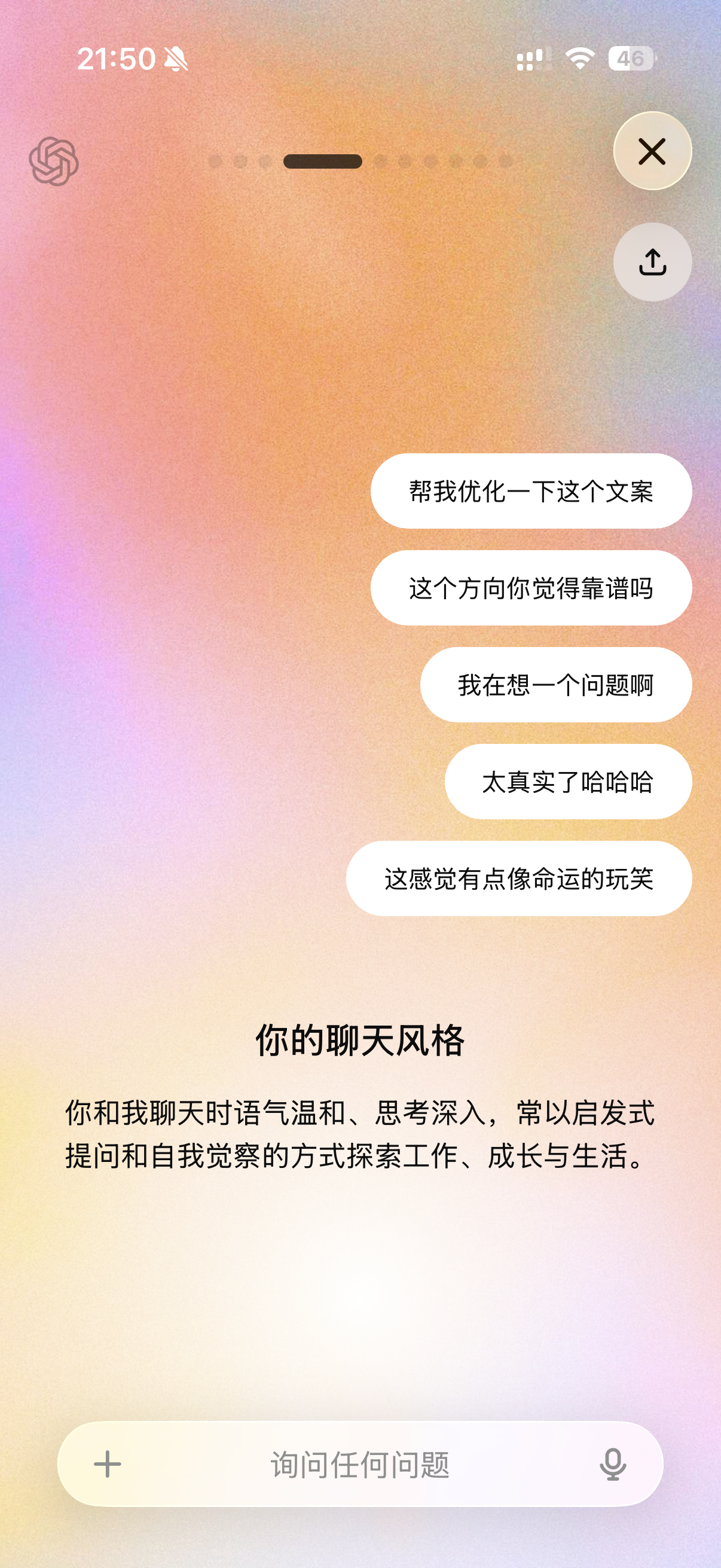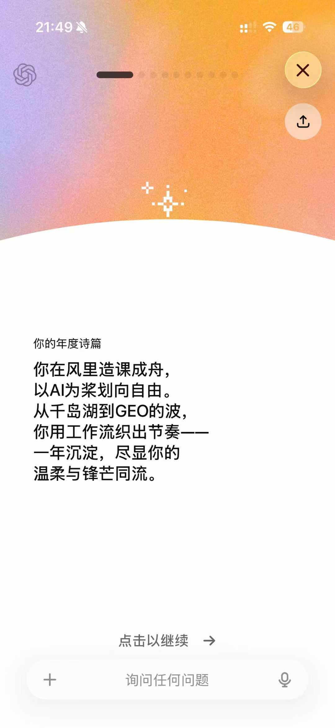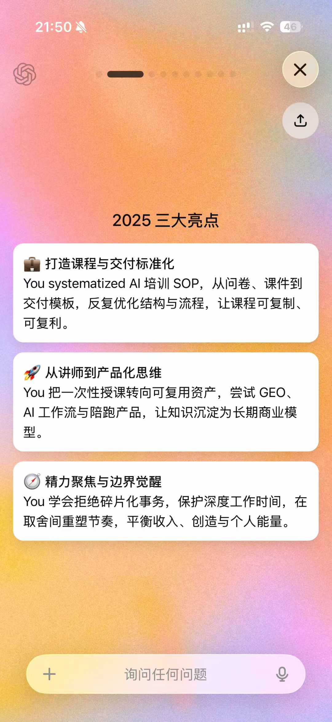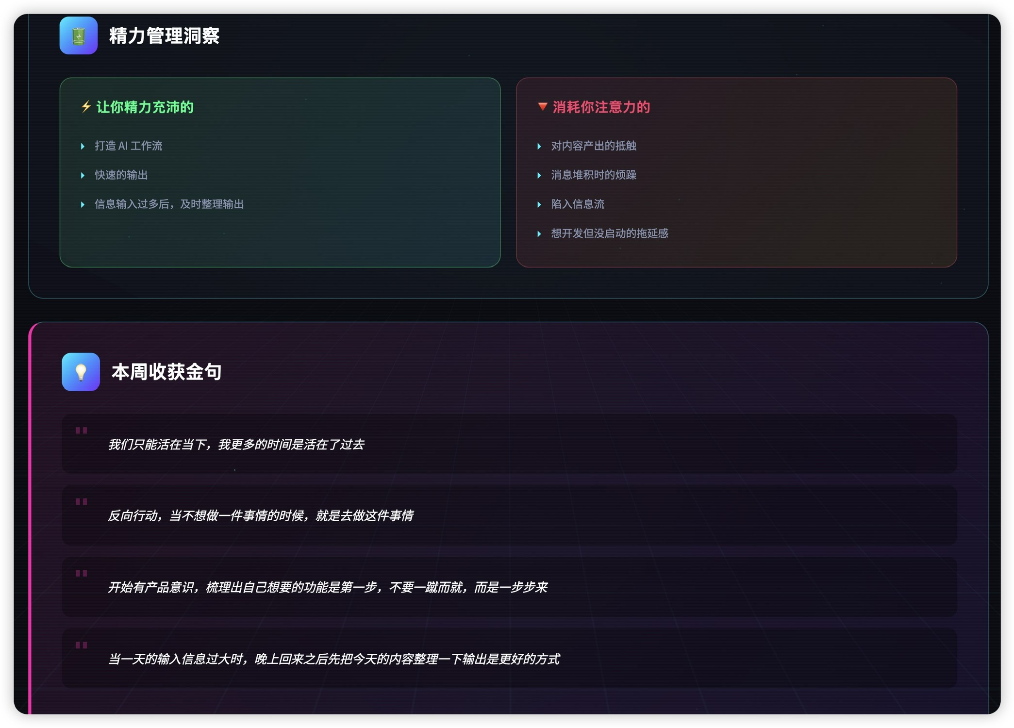 第二,每日朋友圈。今年我有个强制每天要做的事,每天都要发一个朋友圈,这条朋友圈会是我今天印象最深刻的事或观点,会记录着我的成长。下一步我也想让 AI 帮我把过去一年发的几百篇朋友圈全部分析一遍。