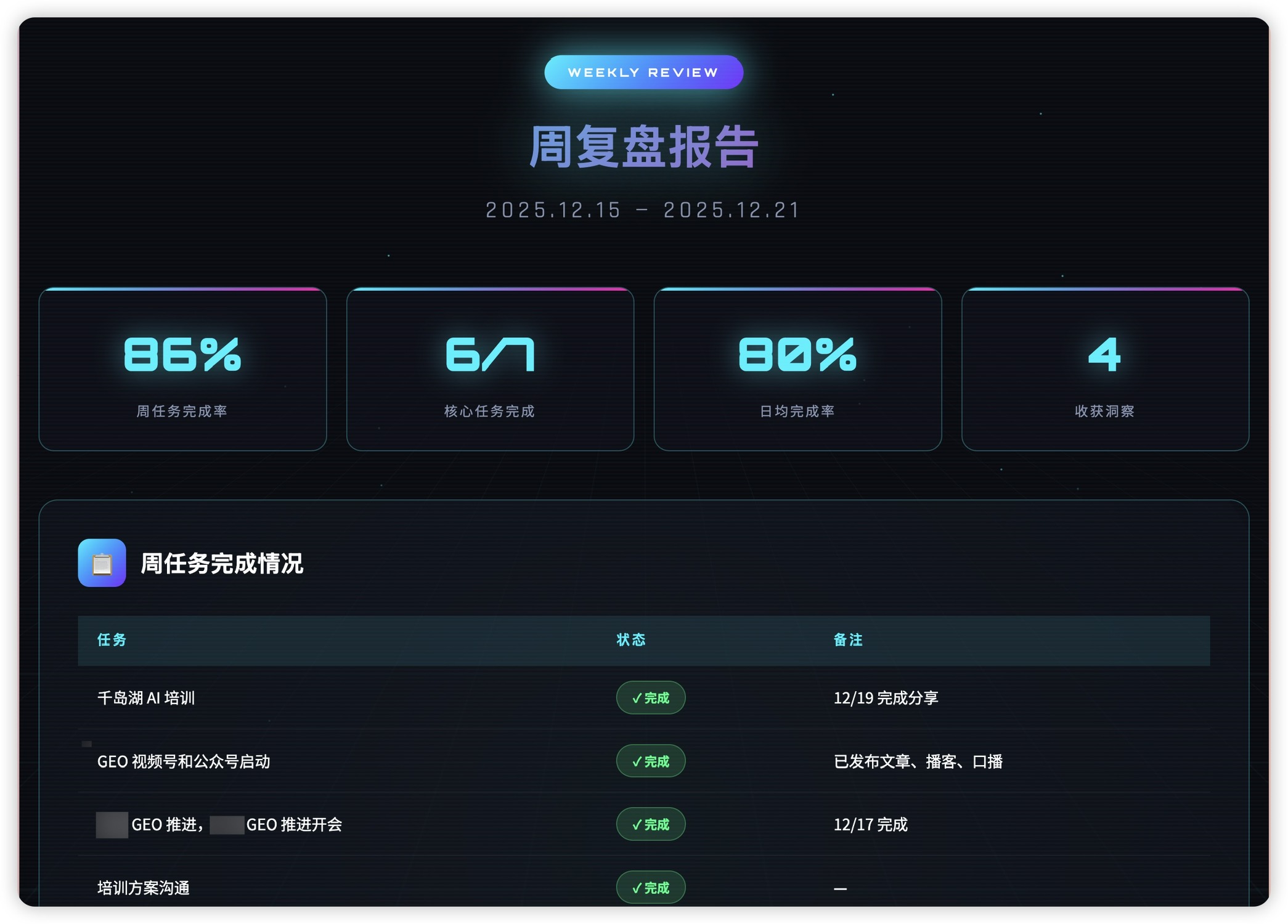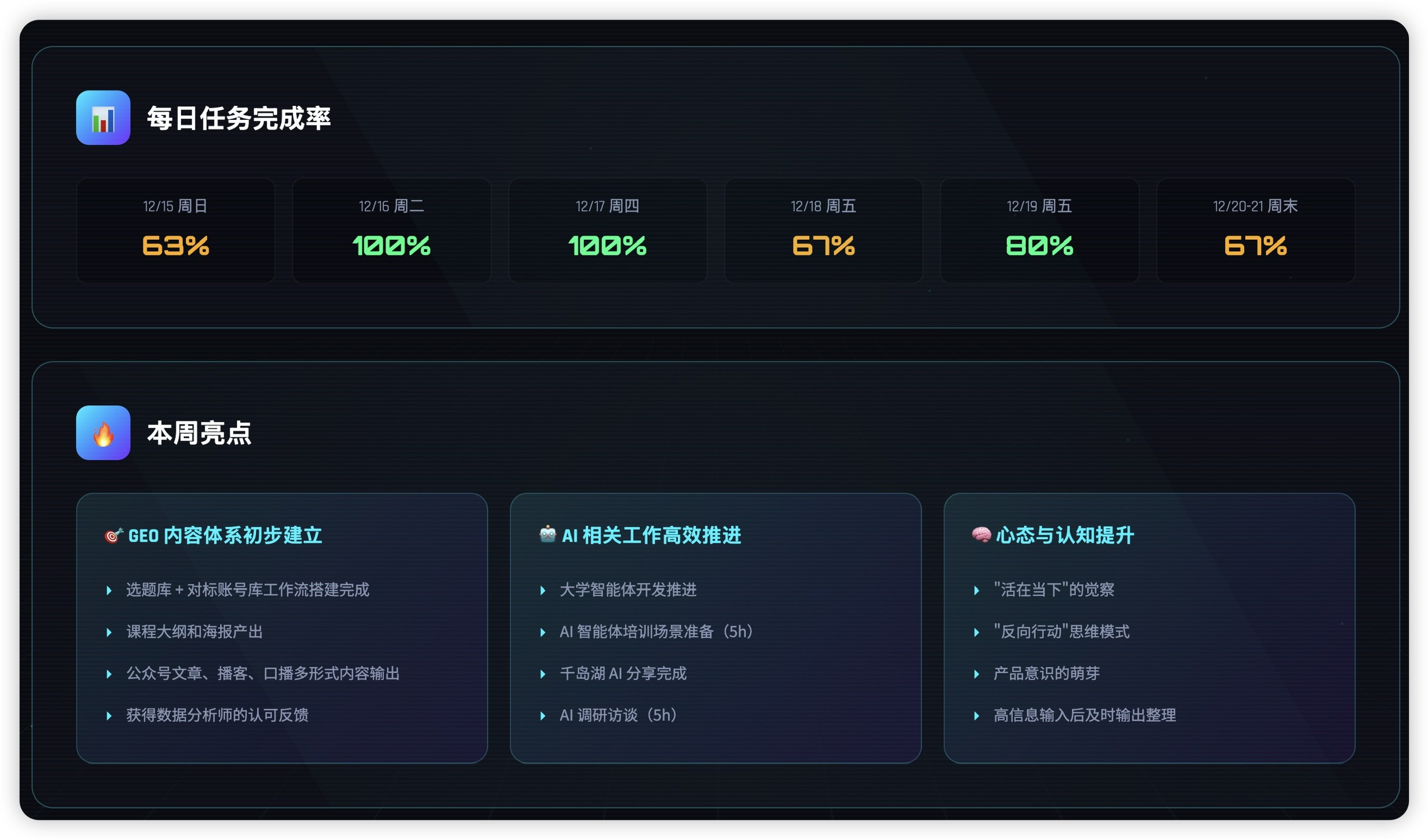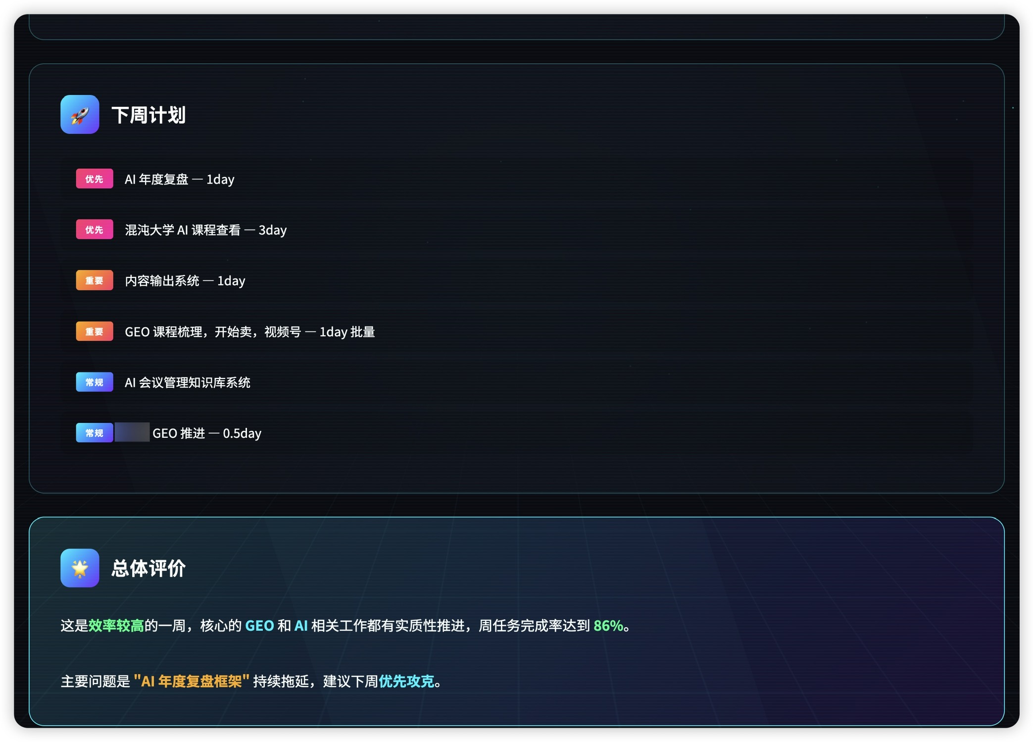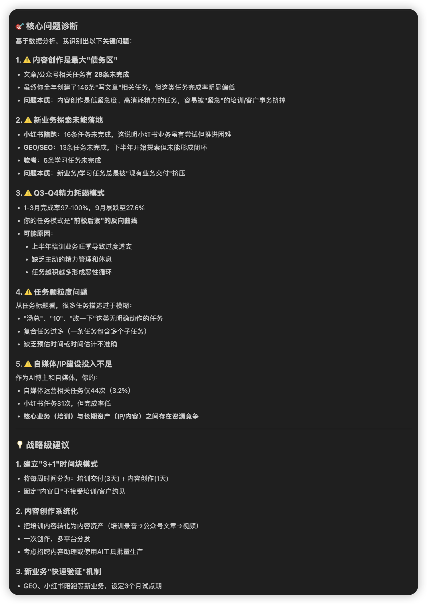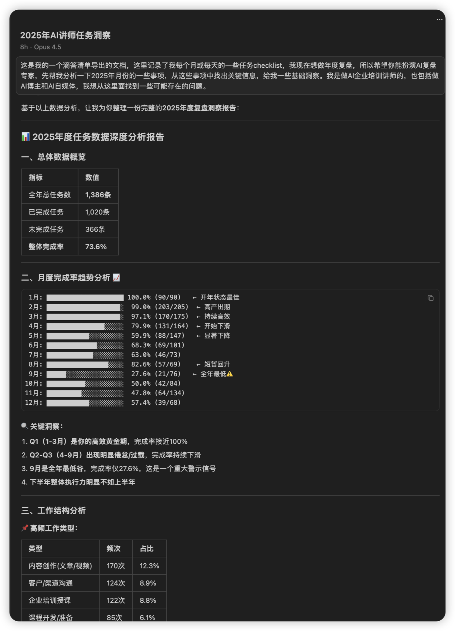 但是现在有了 AI 之后,我可以直接把滴答清单的所有数据发给 AI 来分析,AI 会帮我找到工作任务里的一些关键任务,包括任务的分布、具体事件的完成度等等。