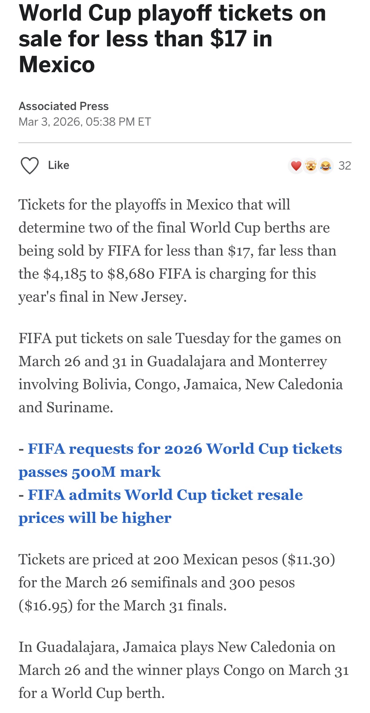 alissi: 美国世界杯门票价格完完全全整整比卡塔尔世界杯贵了好几倍 比如小组赛 卡塔尔: 分三档,$105到$210 美国:也分三档但根据热门程度票价都不太相同,但最便宜第三档也要$140,只要有强队的都$200起,最贵的美国对巴拉圭的第一档要$2735 比如半决赛 卡塔尔:$137 到$956不等 美国:$930起,最贵要到$3295 国际足联怎么想的