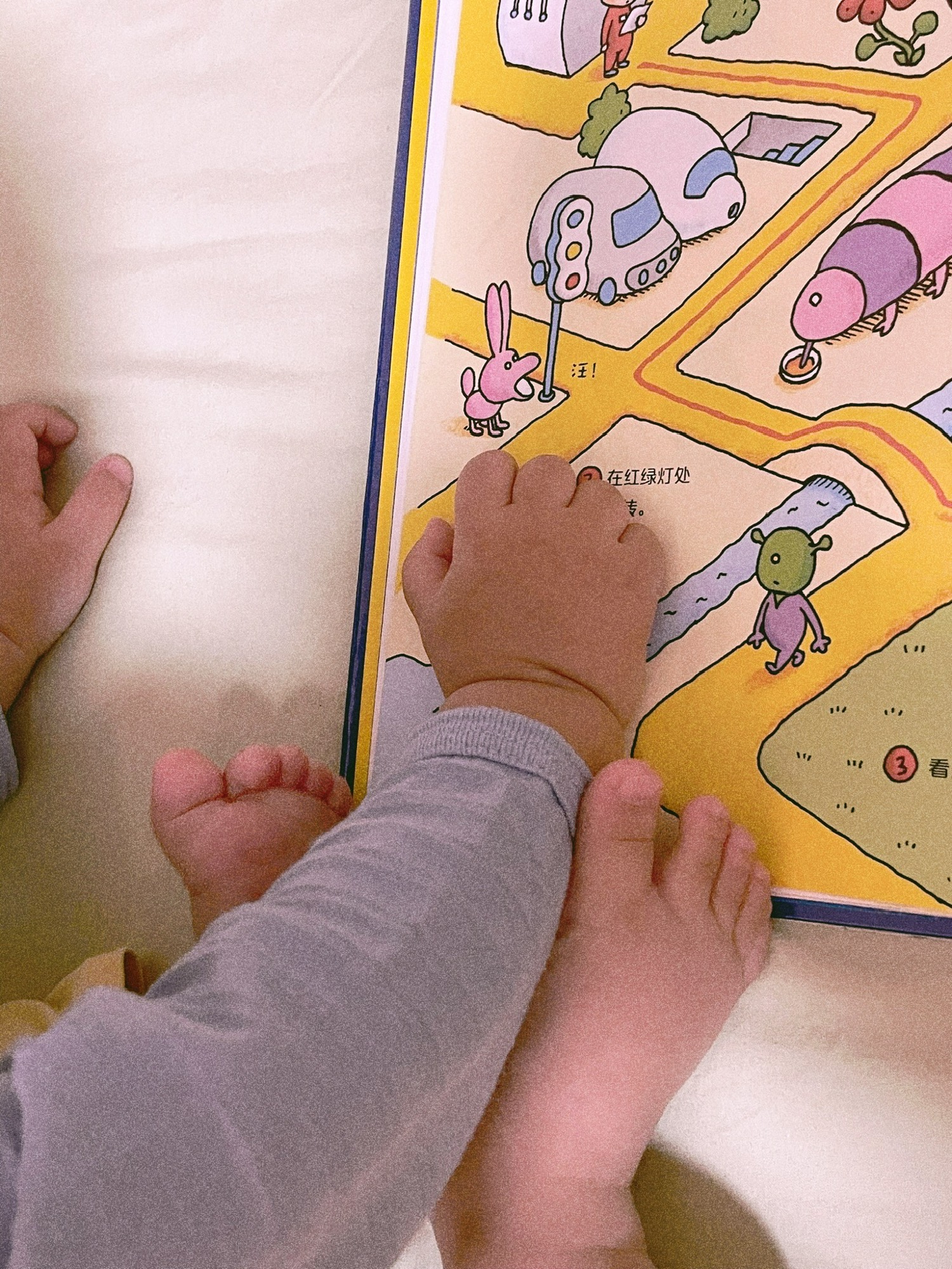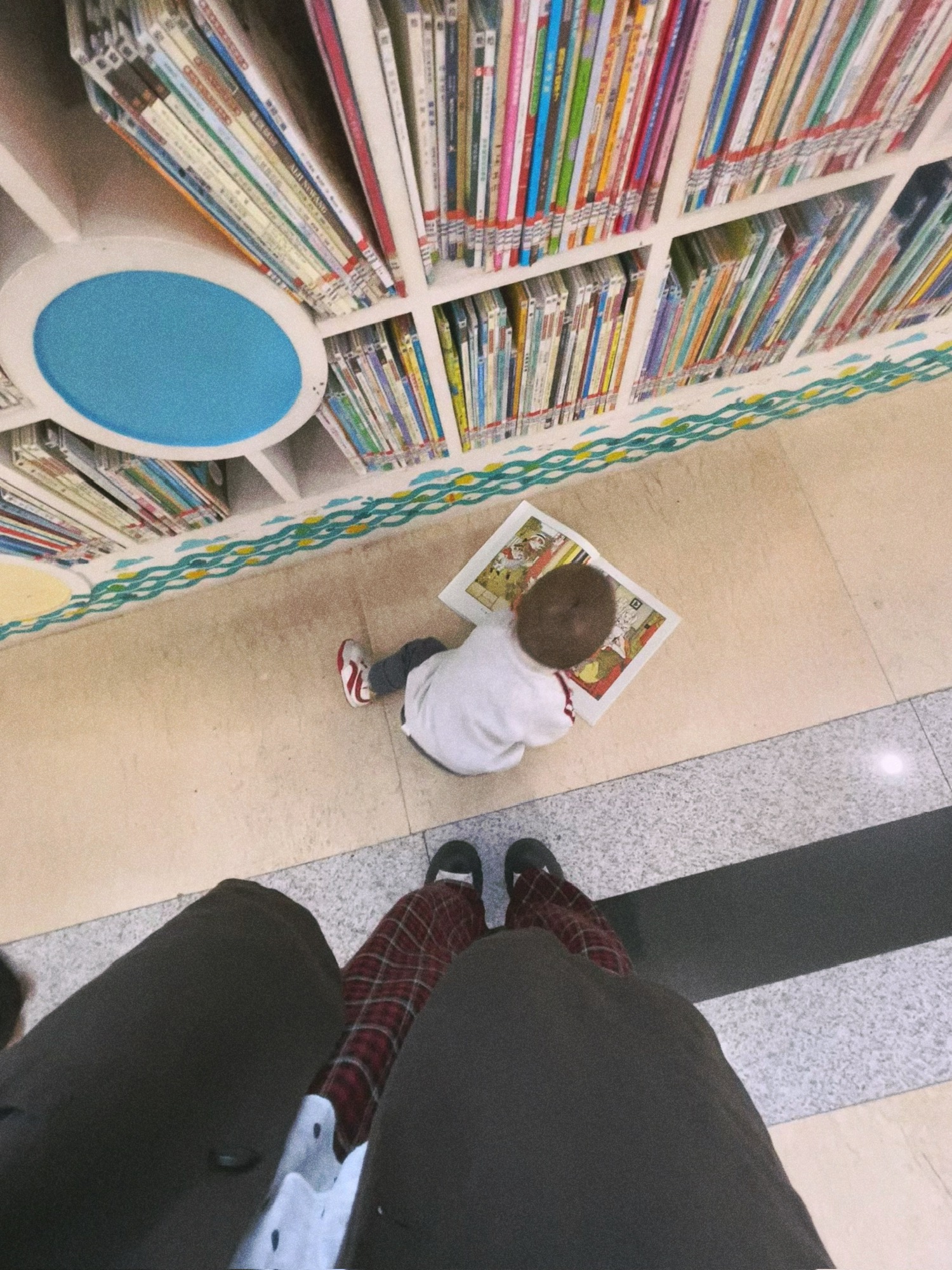 今天去图书馆,我在自助机还书,BB自己从旁边的还书小车里拿了一本有猫猫的书坐在地上看。