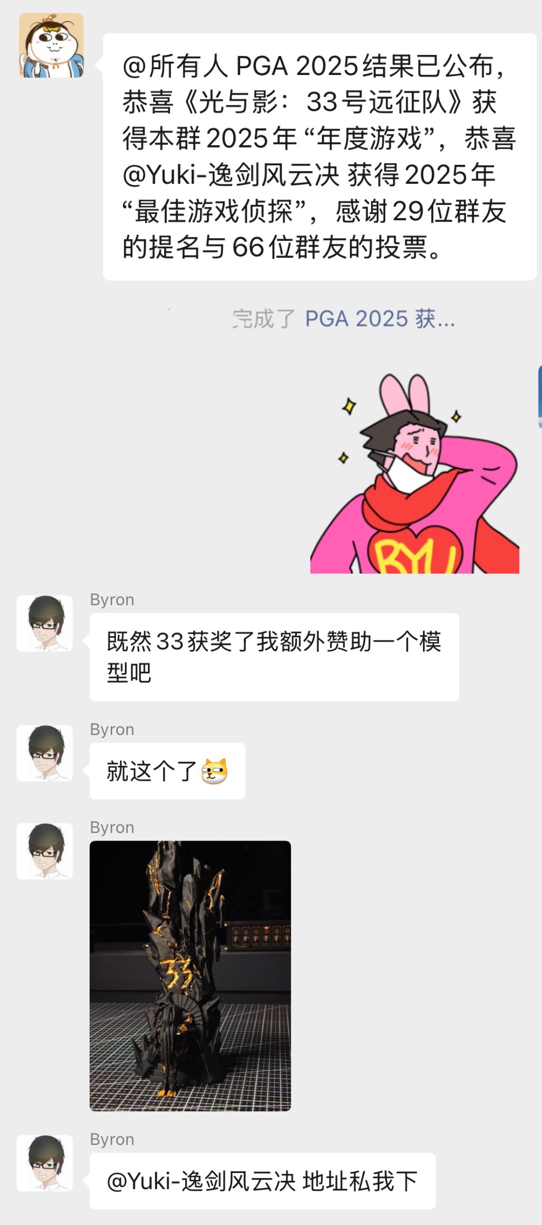 其实我一直觉得拿到PGA最佳游戏侦探,然后被朋友送绘母雕塑是一件很普通的事情,不理解为什么有人会刻意发出来炫耀。因为我知道被朋友送绘母雕塑的人多的是,大家的朋友应该也都会给你们送绘母雕塑呀。其实我朋友