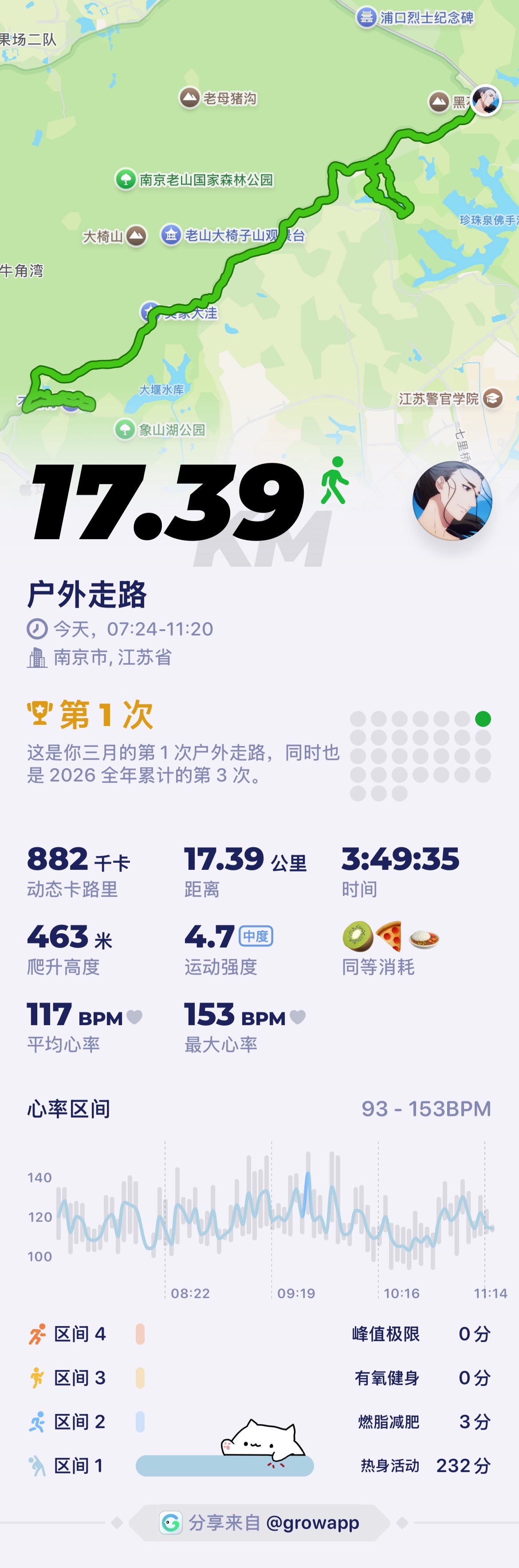 早起去老山徒步,走了17公里,腿快要走废了,
