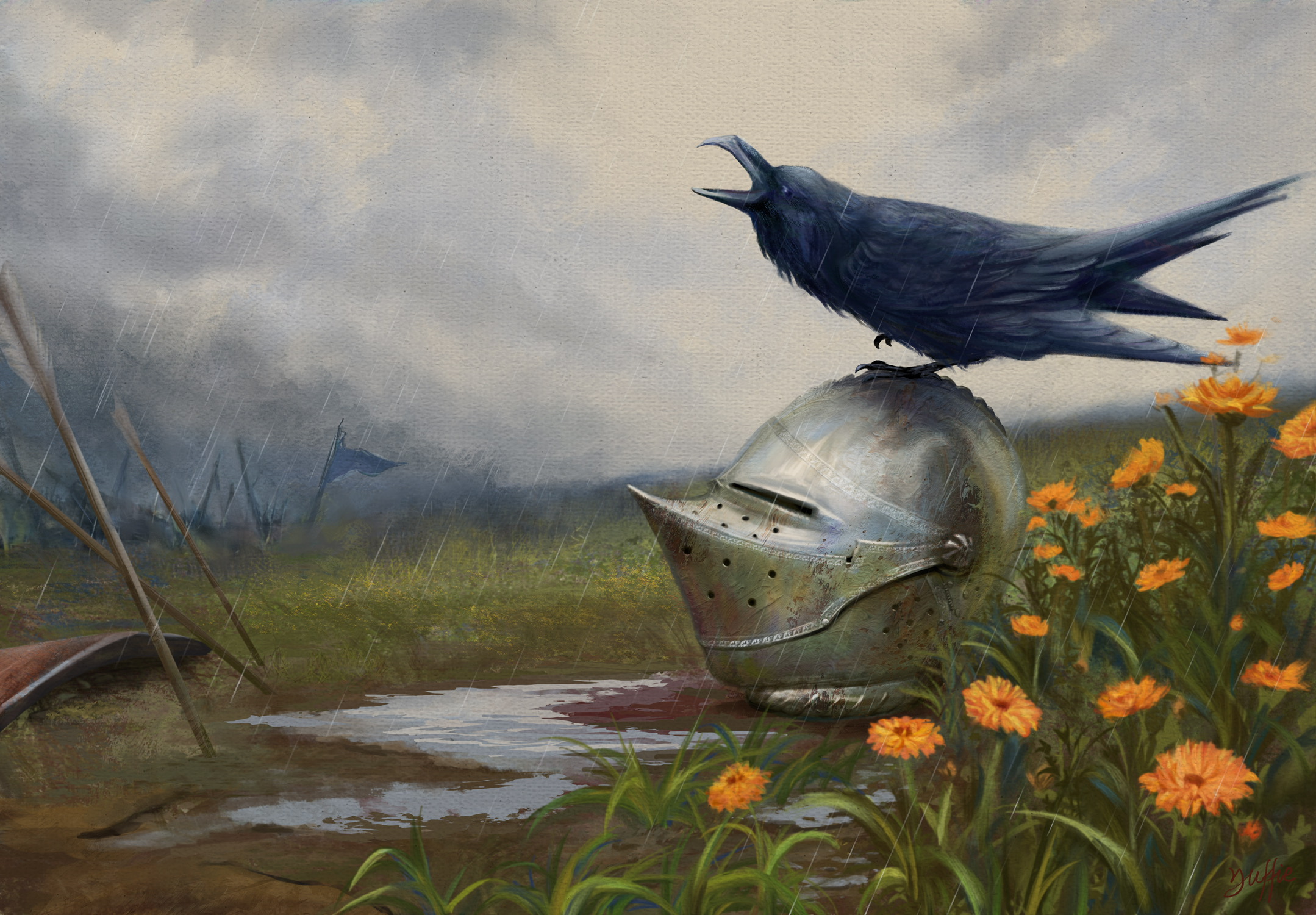 第一只乌鸦是清晨来的。它落在头盔顶上,歪着头看了很久。然后它张开嘴,发出一声沙哑的、撕裂布帛般的叫声。那声音在空旷的战场上滚了一圈,被雨打湿,变得又重又钝。