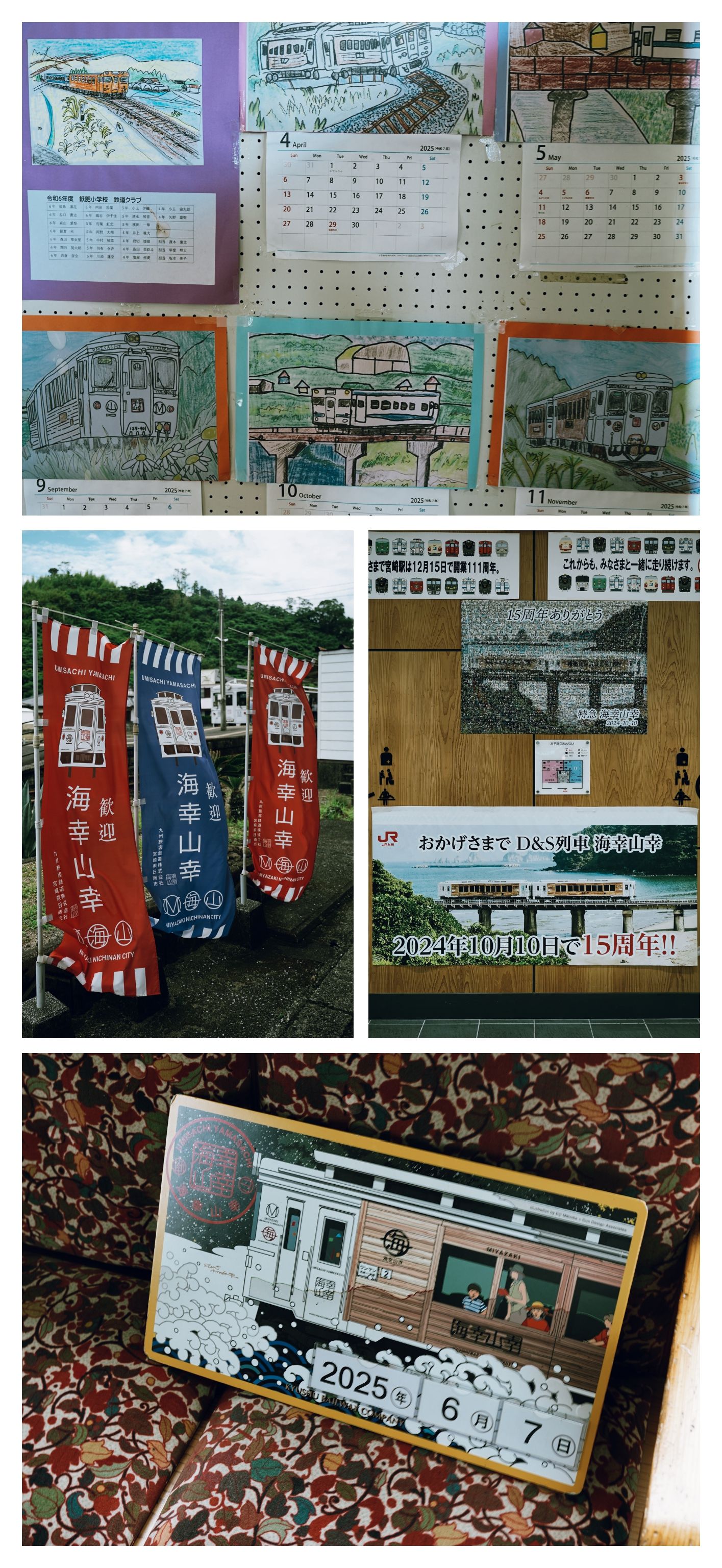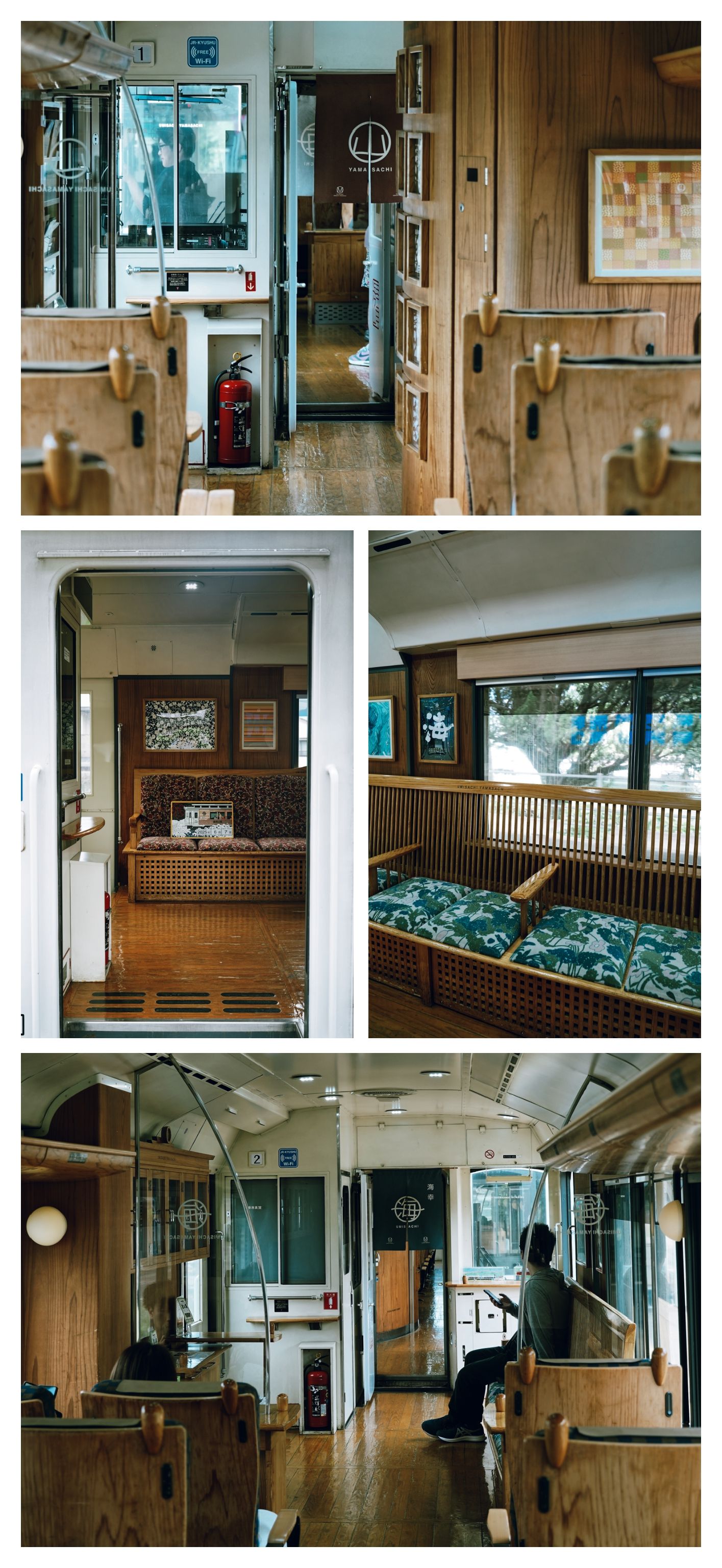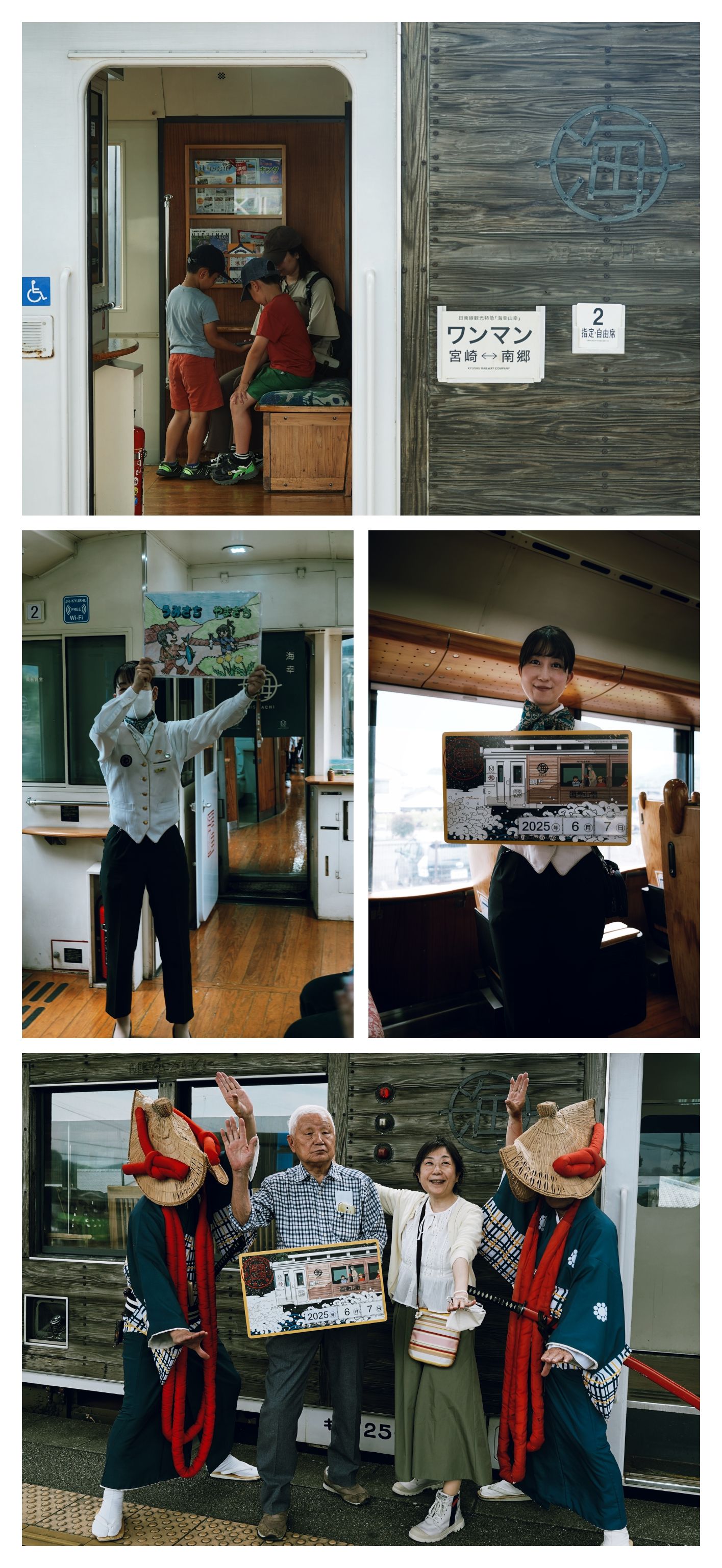 列车起名自宫崎神话传说“山幸彦与海幸彦”,对应分成了“山”与“海”两节主题车厢,车厢外独特的木饰也是来自当地沃肥木。列车在经过鬼的搓衣板时会特地停下来,播放列车主题曲让大家慢慢欣赏宫崎这边独特的沿海地貌。停靠沃肥站时,会有当地居民换上传统服饰途摆出当地泰平舞的经典pose和大家合照,途中乘务员小姐姐还特别绘声绘色地讲述了山幸海幸的神话故事。真是从里到外地把宫崎特色展示到了极致😌