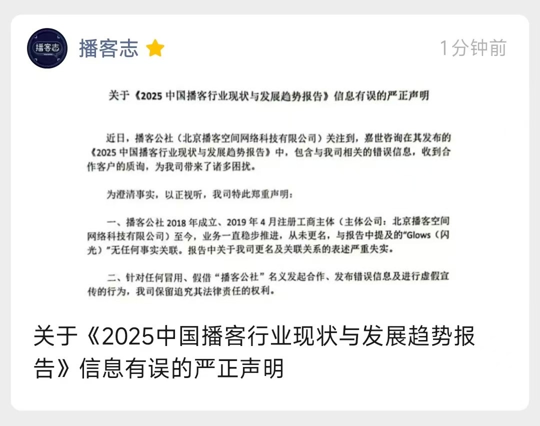 关于《2025中国播客行业现状与发展趋势报告》信息有误的严正声明