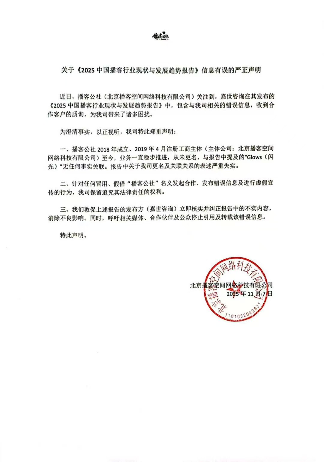 近日,播客公社(北京播客空间网络科技有限公司)关注到,嘉世咨询在其发布的《2025中国播客行业现状与发展趋势报告》中,包含与我司相关的错误信息,收到合作客户的质询,为我司带来了诸多困扰。