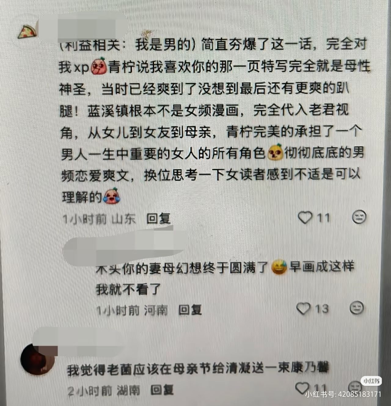 只是如今这个结尾,一定就会精确踩到一些人的雷点或爽点。比如以下这条评论,一些女读者甚至觉得恶心。我看到时,感觉还好,因为我一直就喜欢带恋母情结的男性角色,大概是这类男角色能让我感受到微妙的掌握感吧,而且我也能找到与我有类似感觉的女读者。