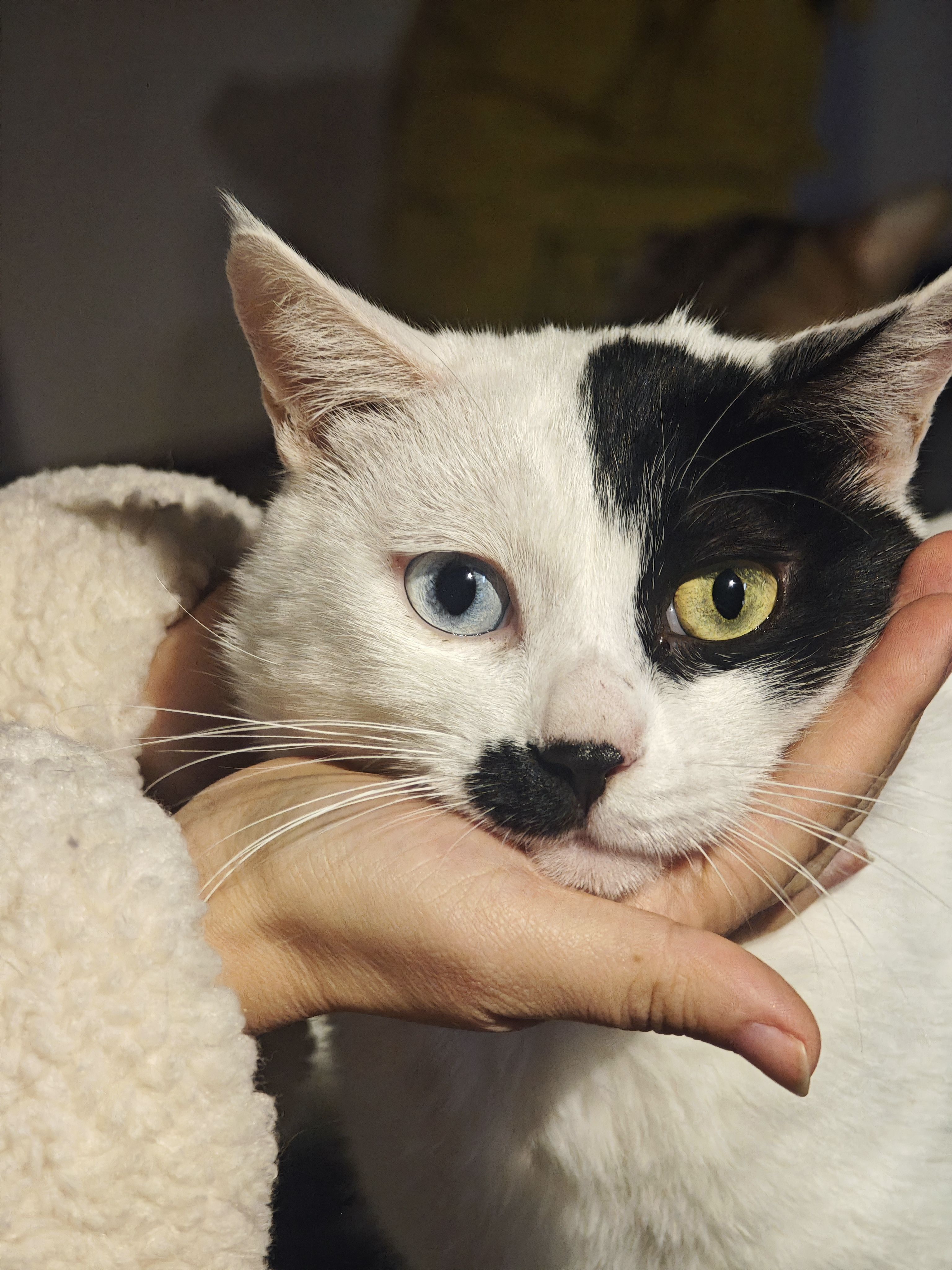 但它极为亲人,或许是被人类救下的缘故,喜欢跟人类贴贴,可可爱爱的。不过也因为对其他猫大打出手,被关在了胆大屋,住一屋的喵,也大多拥有差不多属性。